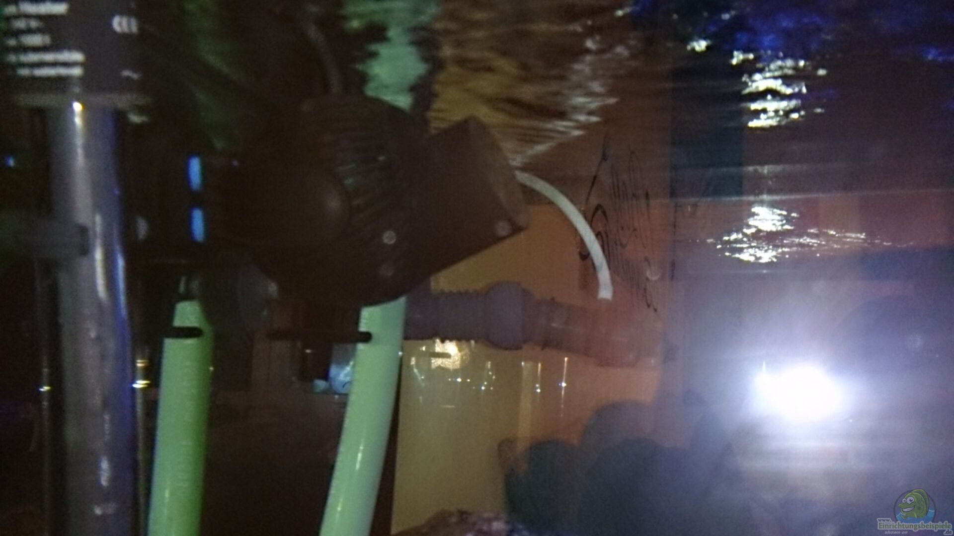 Um die schon sehr gute strömung zu unterstützen, ist an der stirnseite ein Tunze 6025 angebracht (ca. 2500l Pumpleistung), diese ist auf die wasseroberfläche gerichtet.