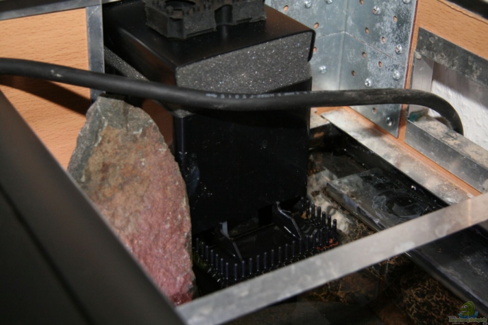 GHL Aqauariumcomputer, Temperatur und PH-Wert Messung, UV-Brenner, Strömungspumpen. Sauerstoffpumpe zum Regeln des PH Wertes über den GHL Computer (Ich habe noch nie einen solch stabilen PH Wert wie mit diese Konstellation gehabt !) Kleine zusätzliche Pumpe angeschlossen an zusätzliches Leitungssystem quer durch die Abdeckung zum simulieren von Regentagen, wird ebenfalls über Computer gesteuert. Es regnet dann immer mal :-)