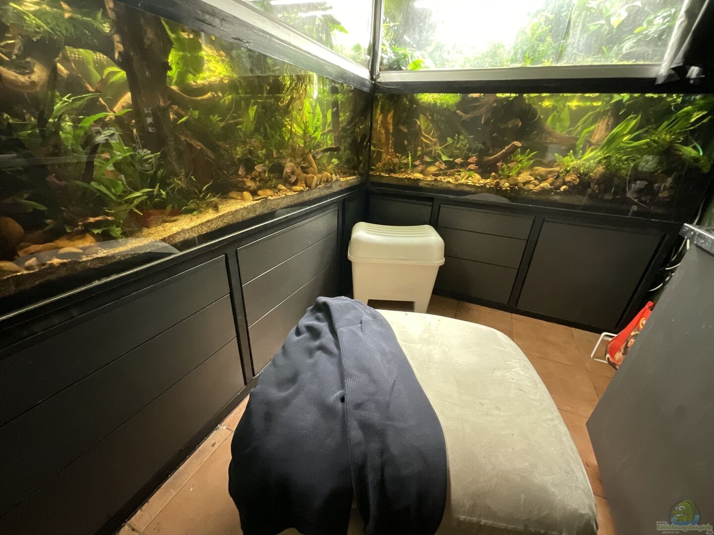 Die Gesamtlänge verteilt sich auf zwei rechtwinklig angeordnete Schenkel von 300cm und 160cm. Der Unterbau ist ein Stahlgestell mit Einbauteilen aus dem Küchenbau. Es geht mir darum ein grundsätzlich pflegeleichtes "urkaubsfestes" Aquarium zu haben. Im Paludarium leben sechs Frösche Amnirana Gakamensis, zu deutsch Galam Weißlippenfrasch. Eigentlich hätte ich Baumsteiger/Pfeilgiftfrösche bevorzugt, aber die sind nicht schwimmfähig, also für das Paludarium nicht geeignet, außerdem [...]