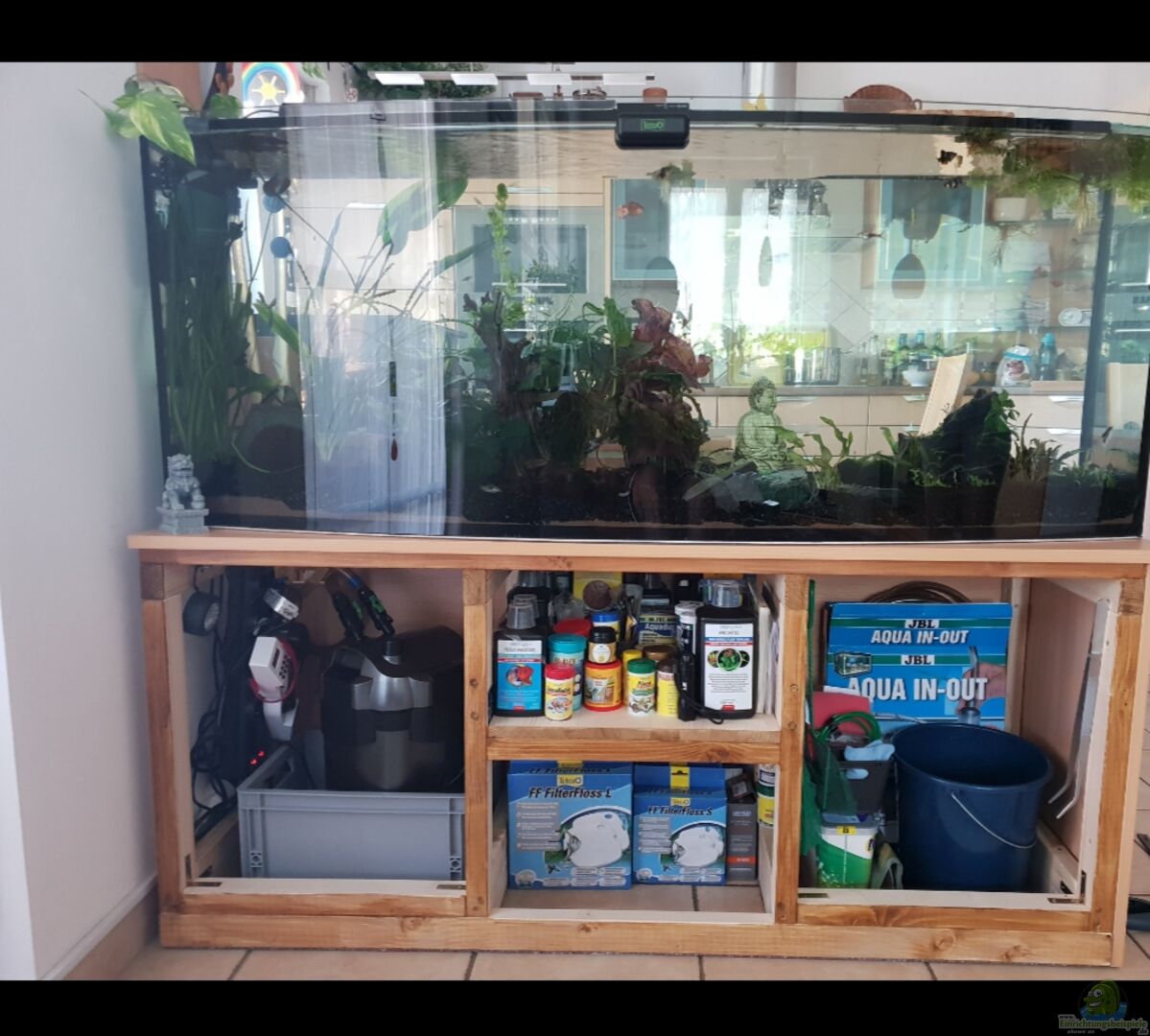 Raumteiler Küche/Wohnzimmer, Unterbau Massivholz Konstruktion mit Beschichtet 19mm Buche Dekorplatten verkleidet, halbe Rückwand mit Linoleum Boden Steingrau verblendet, alles Selbstgebaut, darunter Platz für Technik, Filter und Zubehör. Das ganze Becken liegt auf 2.8mm Lärchenbretter darüber 19mm Deckplatte Buche Dekor Das Aquarium ist mit 4 angefertigten Glasplatten abgedeckt Der Led Alubalken von Amazone ist Preislich unschlagbar! Wir wünschen Euch viel Erfolg bei Eurem eigenen [...]