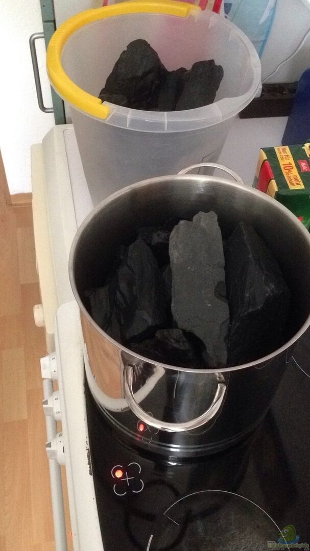 Die Rückwand, rechte Seitenwand (weil es bei mir in der Ecke steht) und der Innenfilter ist mit der Juwel Stone Granit Rückwand und Filtercover beklebt. Dunkle Steine wurden gewaschen und jewels ca 30 Minuten abgekocht, damit alles ordentlich "clean" ist fürs Aquarium und anschlie??end aufgestapelt, damit schöne viele Höhlen und Verstecke entstehen