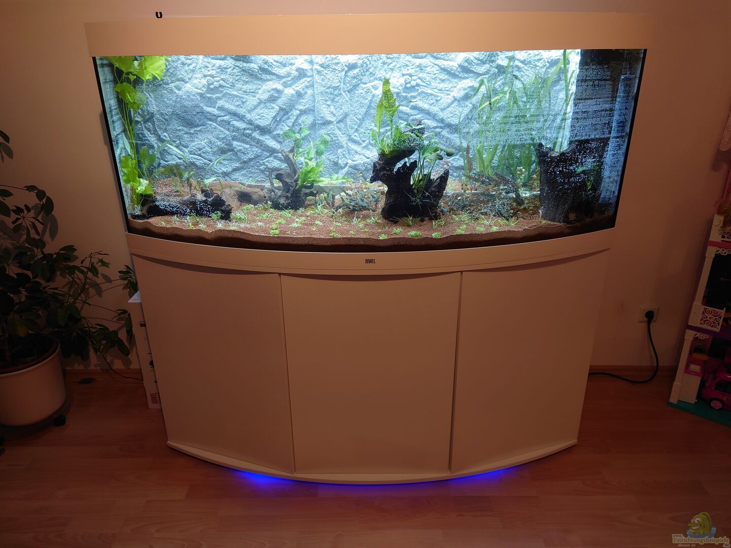 Wie üblich bei Vision Becken von Juwel eine gebogene Frontscheibe mit Sto??verklebung. Becken steht auf dem originalen Unterschrank von Juwel