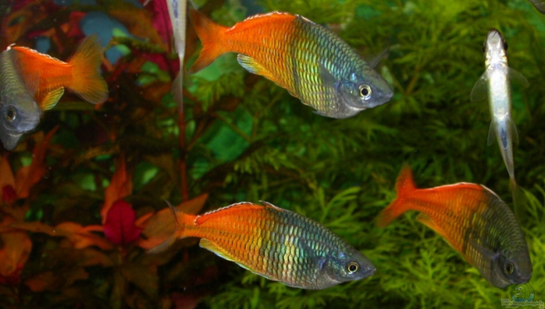 11 Boeseman´s Regenbogenfische (6m/5w) - Melanotaenia boesemani 11 Siamesische Rüsselbarben - Crossocheilus siamensis 4 Längsband Saugbarben - Garra cambodgiensis 10 Schachbrettschmerlen - Yasuhikotakia sidthimunki 1 Feuerschwanz - Epalzeorhynchos bicolor 5 Zebra-Rennschnecken