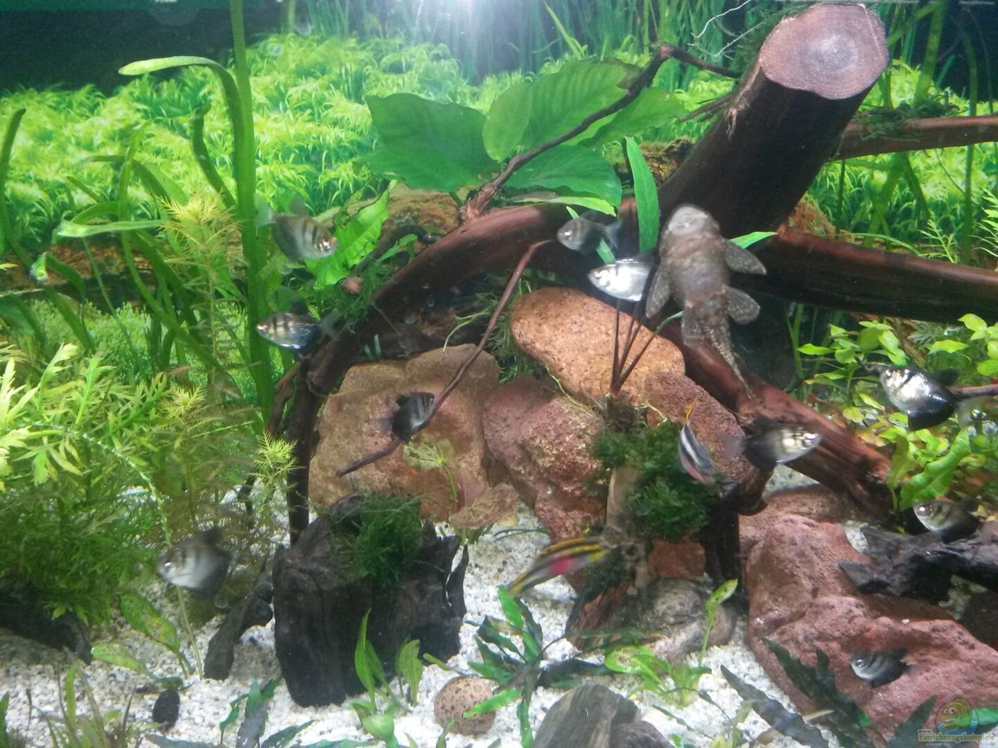 13 Trauermantelsalmler 4 Dornaugen 2 Blaue Antennenwelse 2 punktierte Flossensauger...sind leider verstorben, wir wissen nicht warum... :-( unsere Purpurnen sind nur noch zu zweit und wohnen jetzt allein in einem 54 Liter Becken...damit sie in Ruhe Nachwuchs bekommen können...