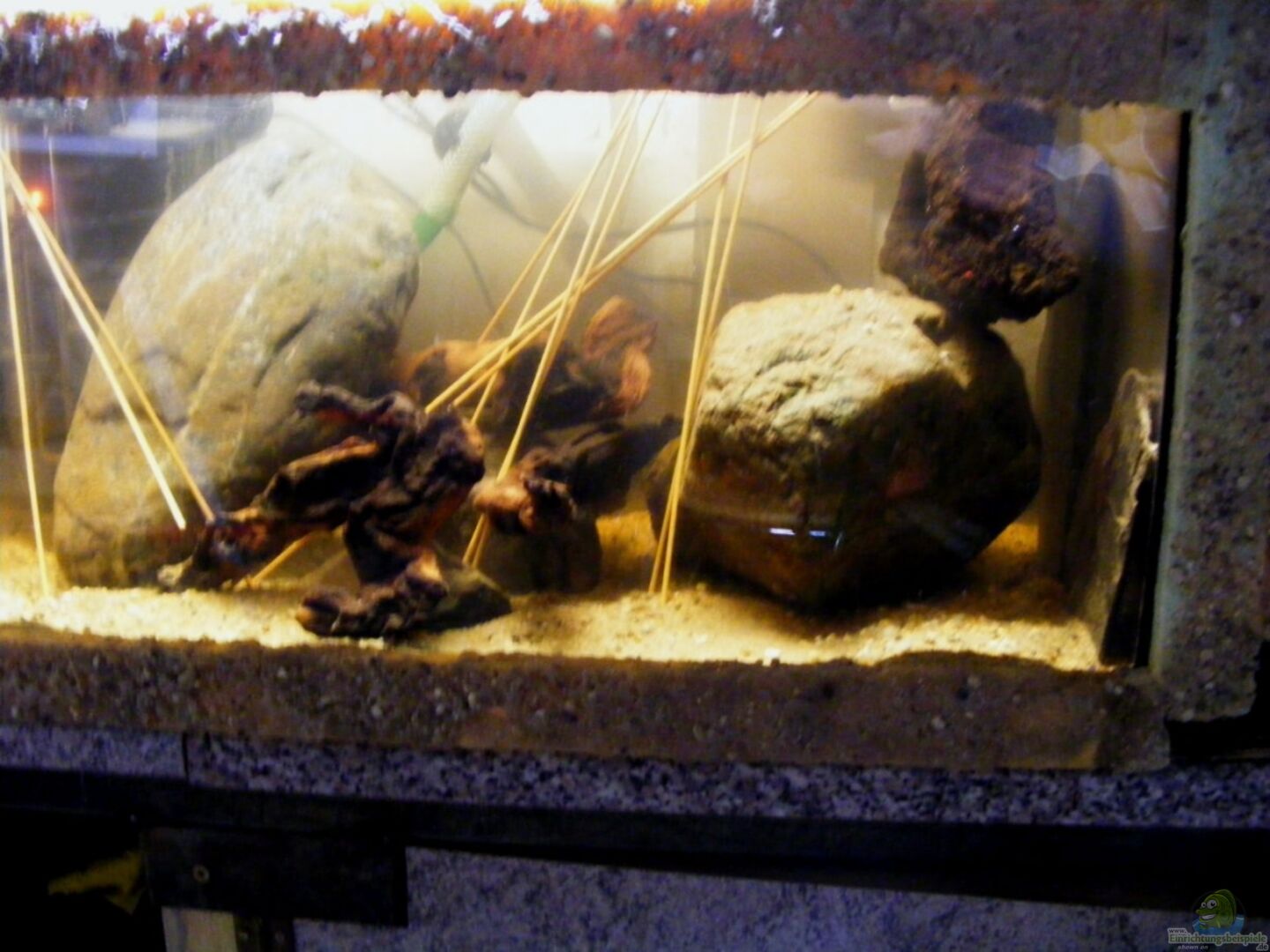 Oberes Becken mit Rückwandmodul ´Aqua-Pro´, innen hohl als gro??e Versteckmöglichkeit... Rotholzwurzel, Sumpfwurzelstamm.... Steine Unteres Becken selbstgebaute Reliefrückwand als ??bergang zum oberen Becken... gro??e Steine (grüner Granit)pH-neutral kleinere Steine Wurzelholzstücken Bambuszweige für ??stenachstellung