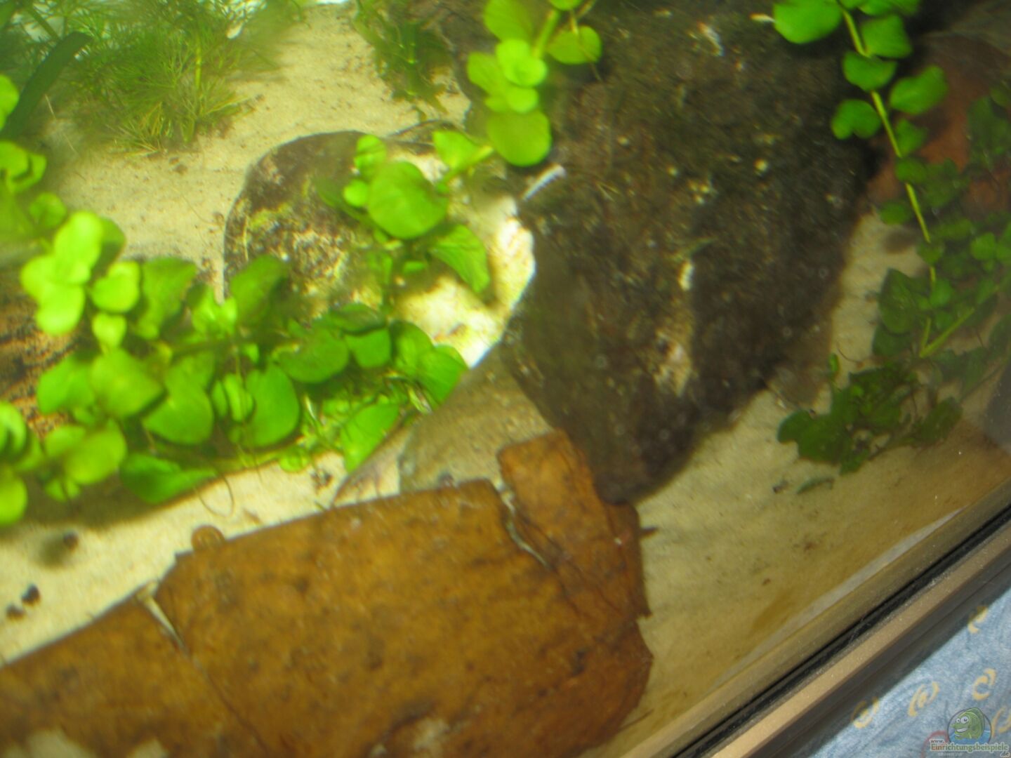 Ich habe versucht mit Steinen eine kleine Terasse zu bauen, damit der Sand hinten etwas höher ist als vorne. Die Steine sind mit Styropor unterlegt und es befindet sich kein Sand darunter, damit sie nicht untergraben werden können. Au??erdem sind Wurzeln im Becken, diese dienen genau wie die beiden Tontöpfe als Verstecke für die Frösche. Seemandelbaumblätter habe ich ebenfalls rein gegeben.