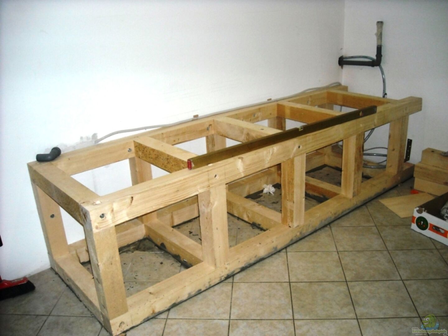 Das Aquarium wurde aus 12mm Floatglas gefertigt, auf Sto?? verklebt und mit einer Sicherheitsnaht versehen. Es verfügt über einen Mittelsteg, Längsstreben unten und oben und einer eingauten Filterkammer mit 4 Kammern. ***** Das Becken kommt von Megazoo. ***** Der Unterbau wurde aus 10x10cm Staffeln vom Baumarkt gefertigt und in eine Estrichausgleichsmasse gelegt um eine idelae Verbindung zu den vorhandenen Bodenfliesen zu ermöglichen. Weiters wurden die Staffeln mit 24 cm langen sechskant [...]