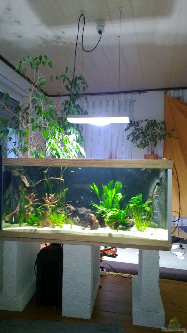 Das aquarium ist marke eigenbau, also ein altes becken komplett auseinadergeholt und neu verkebt, die rueckwand ist aus daemmplatten die mit kunstharz bearbeitet wurde.oben und unten wurden leisten in fichtenholz angebracht und an den ecken wurden aluleisten angeklebt.die obere abdeckung besteht aus plexiglas, die dreimal unterteilt ist.Selbst eingeklebte 3d rueckwand. An den seiten wurden ecken fuer diverse technik eingeklebt. Das becken läuft seit 5.2013 . Einen monat später kam der besatz. Co [...]
