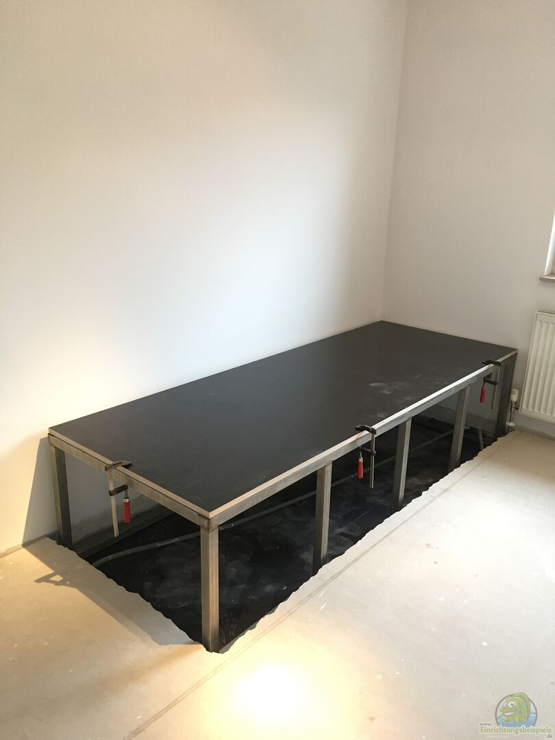 - Unterschrank selbst gebaut aus 40x40 mm Nierosterstahl - Aufbau : Fallschutzmatte - Siebdruckplatte 21mm - Unterschrank - Dachfolie - Siebdruckplatte 21mm - Aquariumunterlagsmatte - Becken - Bohrung im Boden für Wasserwechsel - Mehrkammerinnenfilter mit 4 Kammern über die ganze Tiefe - Becken wurde genau nach meinen Wünschen angefertigt und bis vors Haus geliefert > mit 6 Mann und meiner Ehefrau kam Becken schlie??lich durchs Fenster in den richtigen Raum
