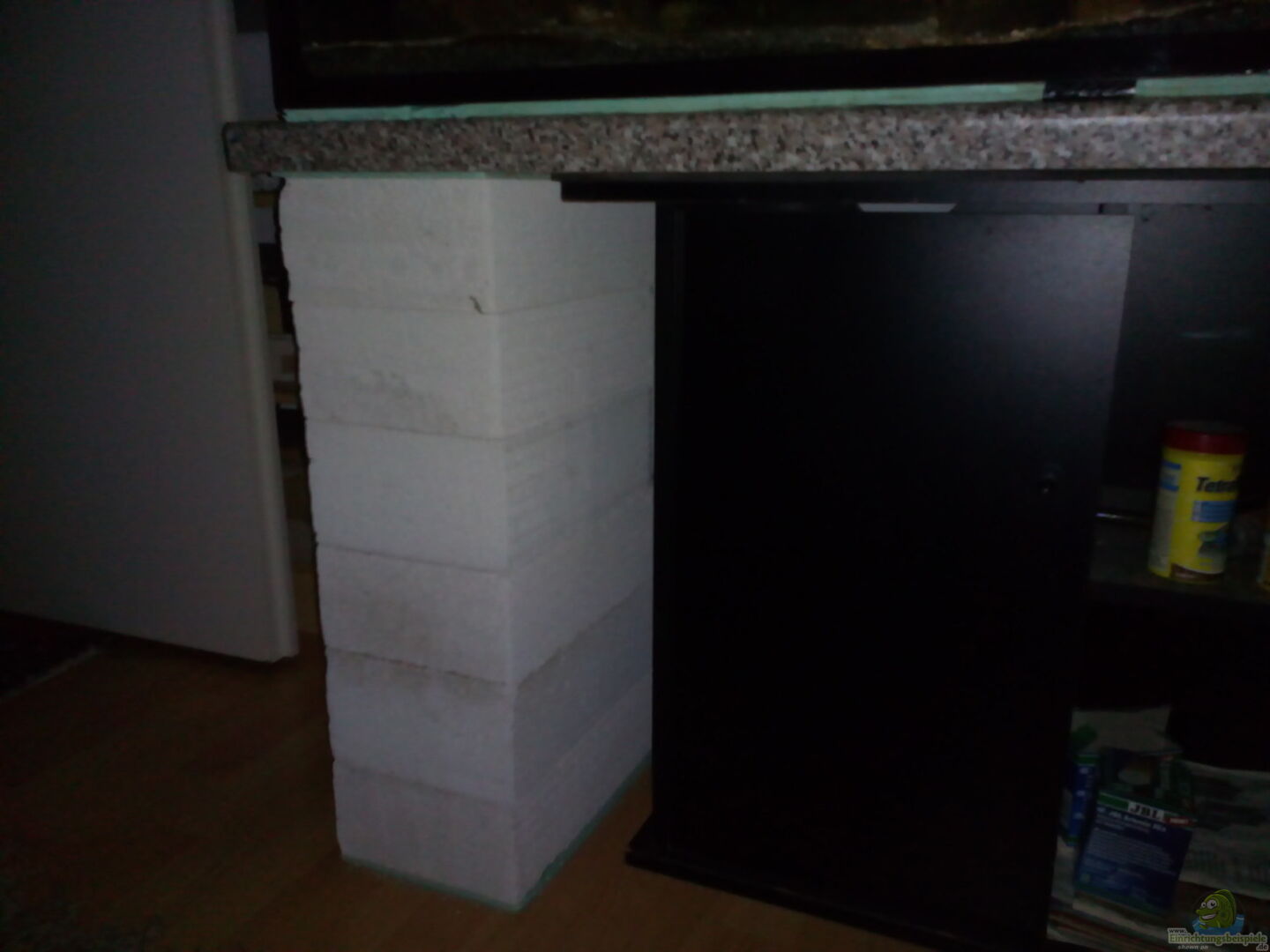 12mm Floatglas rundum mit Frontscheibe aus Wei??glass. 2 längst und eine Querstreben.Rundum sto??verklebt mit Wulstsicherheitsnaht.Bodenscheibe 12mm, einteilig.Abdeckscheiben 2 Stück 4mm mit Griffloch zum abnehmen Der Unterbau besteht aus einer grau gemusterten Küchenarbeitsplatte mit den Ma??en 180 cm/60 cm/4 cm B/T/H. Diese liegt auf einem originalen Unterschrank eines Juwel Rio 240, der mittig steht, und 2 Säulen aus Porenbeton Steinen an den Seiten auf.Ich fand das der Unterschrank in der [...]