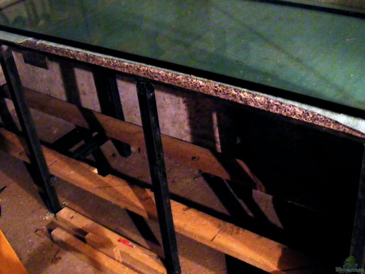 Steht auf selbstgemachtem Rahmen aus 40er Profilrohr(siehe Bild)dazu MDF-Platte und zwei Lagen Schaumstoffmatte 3mm Rückwand Selbst-Herstellung Diese besteht aus zwei Hälften und wird mit Feinstsand behandelt, um eine Uferlehm-Schicht zu bekommen Das Becken wird offen betrieben, welches die Möglichkeit ergibt mit Pflanzen zu agieren, wie man sie von den Randbepflanzungen aus den Biotopen her kennt. Dazu mehr unter sonstiges.