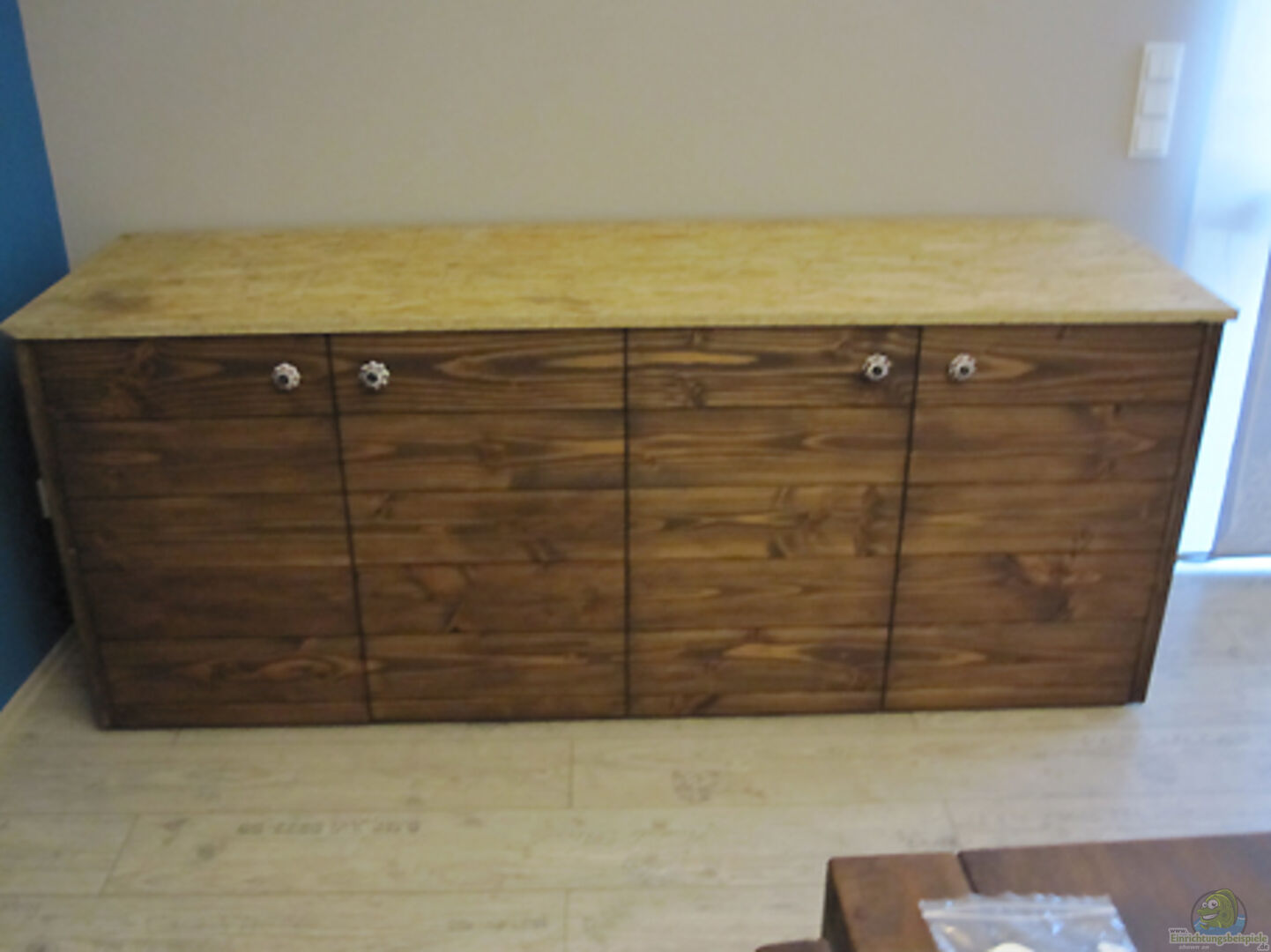 Eingeklebter 3 Kammer Bioinnenfilter (b.50cm h.58cm t.13cm) Pumpe mit 1200L Vördervollumen 3 Bohrungen im Boden (2x Ansaugung, 1x Ausströmen, 25 mm PVC Rohr) Strukturrückwand Aluabdeckung Selbstgebauter Schrank ( Metallgestell mit Holz verkleidet, 4 Türen)