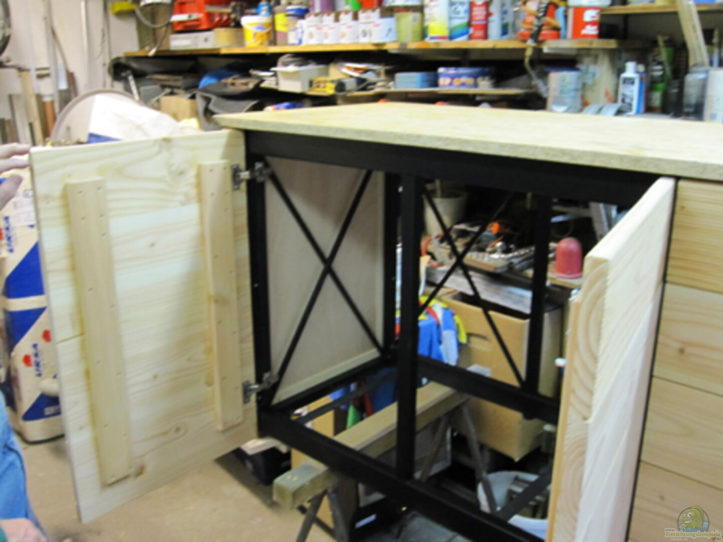 Eingeklebter 3 Kammer Bioinnenfilter (b.50cm h.58cm t.13cm) Pumpe mit 1200L Vördervollumen 3 Bohrungen im Boden (2x Ansaugung, 1x Ausströmen, 25 mm PVC Rohr) Strukturrückwand Aluabdeckung Selbstgebauter Schrank ( Metallgestell mit Holz verkleidet, 4 Türen)