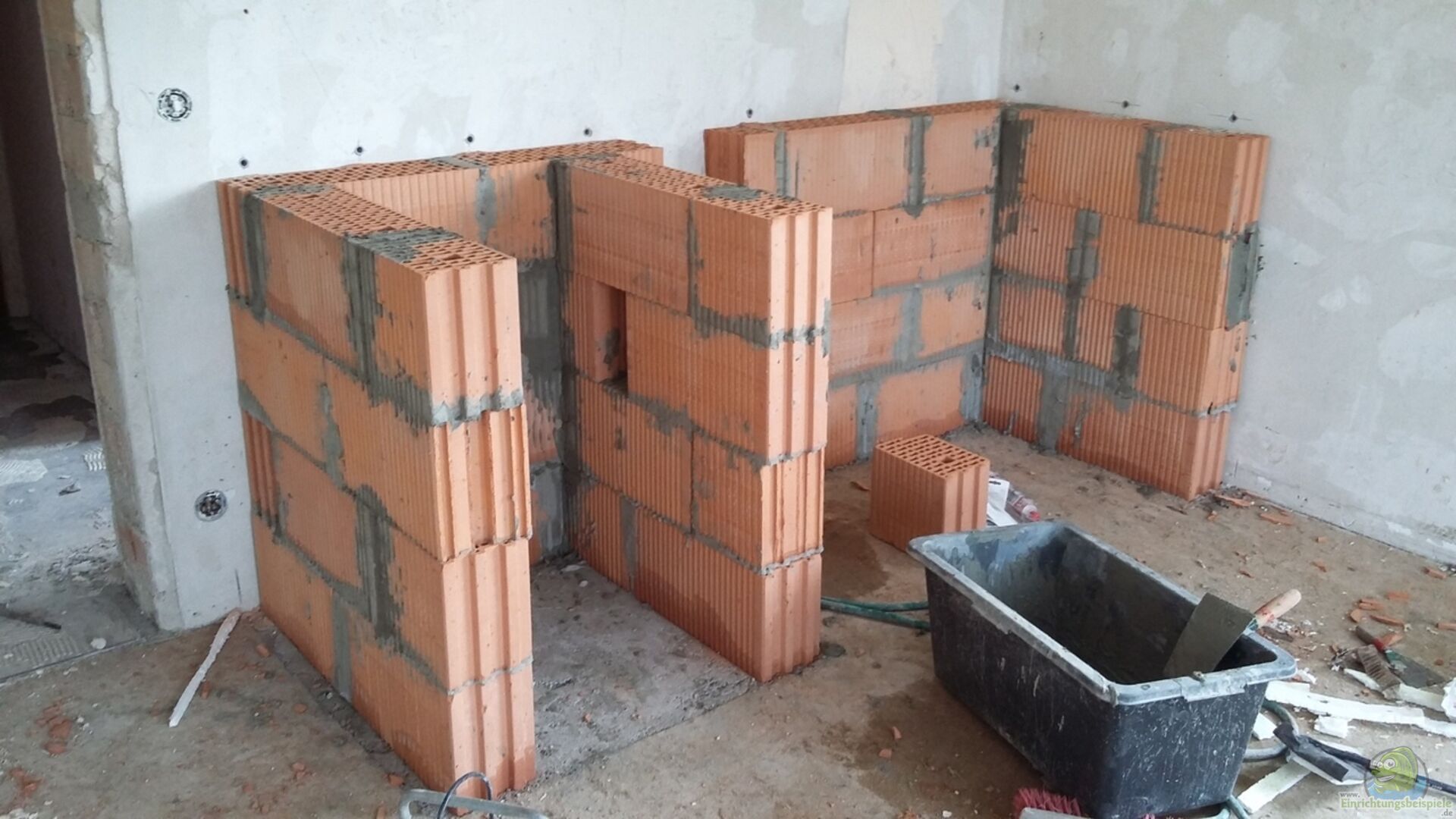 Das Becken ist eine Sonderanfertigung aus 15mm starken Floatglas mit Wasserstandsblenden aus Schwarzglas. Mittig an der Rückwand wurde ein Doppelwändiger Filterschacht mit bodennaher Ansaugung und ??erlauf eingeklebt. Im Schacht befinden sich zwei 55mm Lochbohrungen. 1x für den Filtereinlauf und 1x als Notüberlauf. Eine dreiteilige Glasabdeckung mit kleinen Futteröffnungen verhindert eine grö??ere Wasserverdunstung. Der Aquariumunterschrank wurde aus Ziegelsteinen selbst gemauert und durch [...]