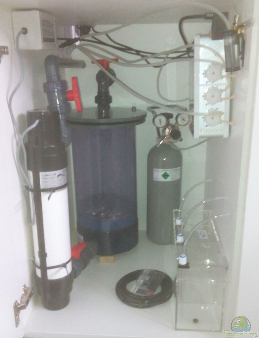 Beregnungsanlage: Für den automatischen Wasserwechsel gibt es eine Regensimulation. Im Unterschrank ist hinter der RO-Anlage ein Dennerle Nanocube 60 als Regenwassertank eingebaut. Dieser wird von der Osmoseanlage gefüllt, bis ein Niveausensor bei vollem Tank anspricht. Wenn Gewittertag ist, wird dieses Wasser, von einem 75W Heizstab auf 25 Grad vorgewärmt, über eine Pumpe hochgepumpt. Unter den Abdeckplatten des Aquariums habe ich insgesamt 65 Gardena-Bewässerungstropfer angeklebt, über [...]