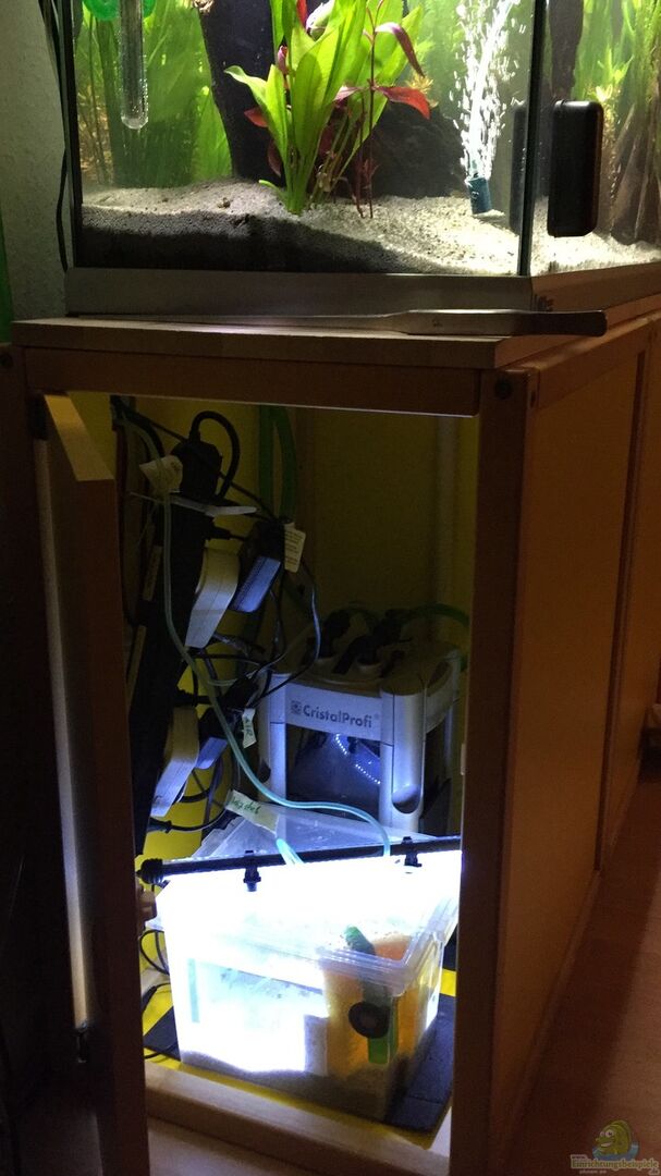 EHeim Aquaball mit einem Filterkorb, um für ein wenig mehr Strömung zu sorgen. Sollten die Nitratwerte zu sehr steigen, würde ich mehr Körbe anbringen. Luftpumpe mit Ausströmerstein.
