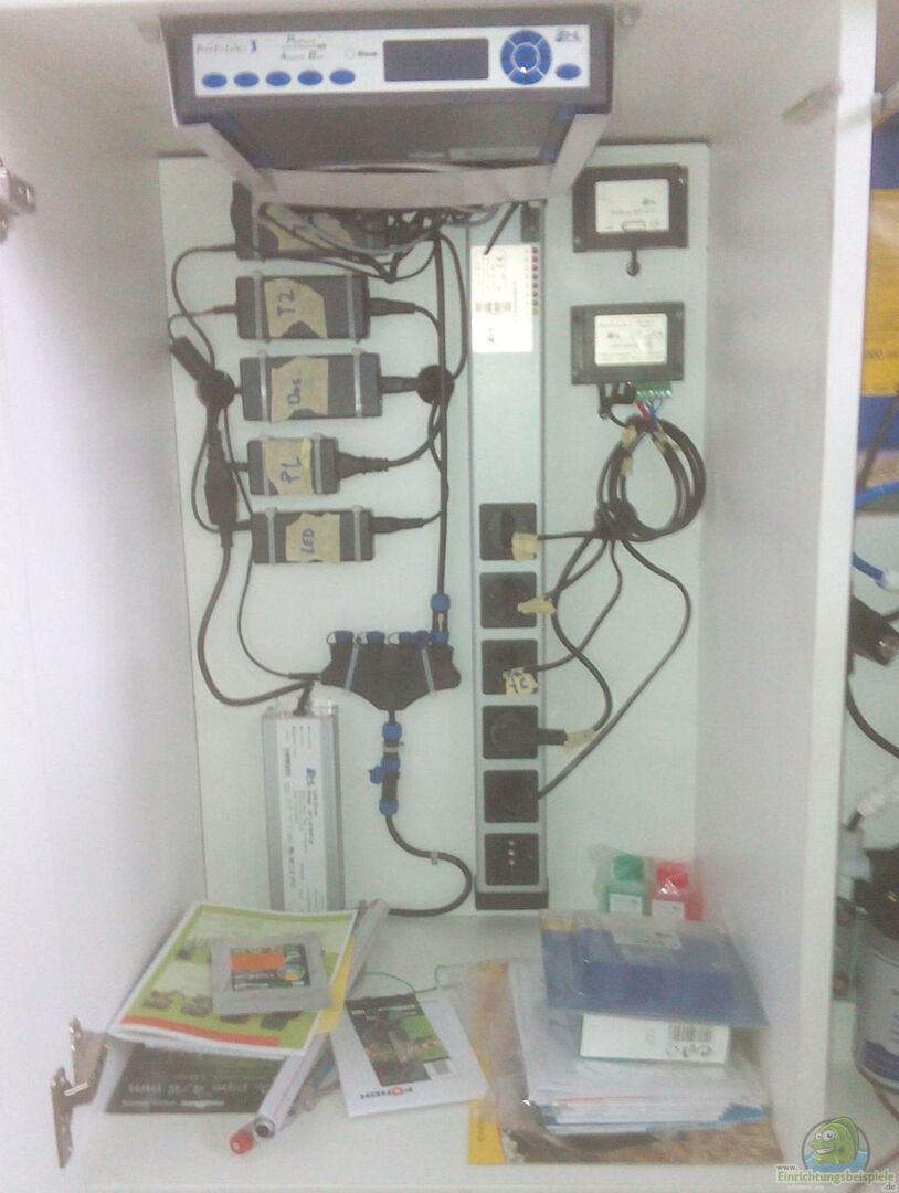 Beregnungsanlage: Für den automatischen Wasserwechsel gibt es eine Regensimulation. Im Unterschrank ist hinter der RO-Anlage ein Dennerle Nanocube 60 als Regenwassertank eingebaut. Dieser wird von der Osmoseanlage gefüllt, bis ein Niveausensor bei vollem Tank anspricht. Wenn Gewittertag ist, wird dieses Wasser, von einem 75W Heizstab auf 25 Grad vorgewärmt, über eine Pumpe hochgepumpt. Unter den Abdeckplatten des Aquariums habe ich insgesamt 65 Gardena-Bewässerungstropfer angeklebt, über [...]
