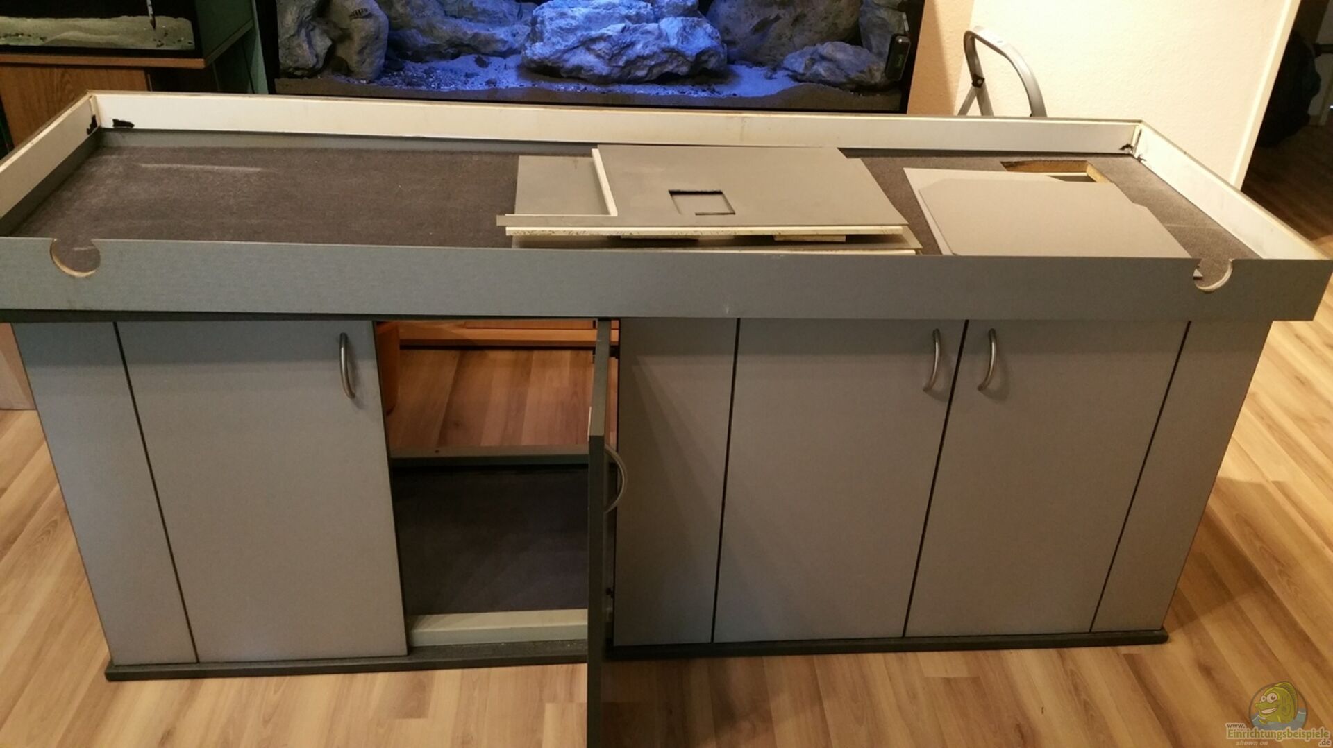Ich habe mich dazu entschieden das Becken vor Ort von der Firma Aquariumbau Ennigerloh kleben zu lassen. Bilder vom Bau sind unten zu sehen. Die Seitenscheiben, sowie die hintere Scheibe wurden mit schwarzer D-C-Fix Folie beklebt, um im Becken eine entsprechende Tiefe zu erzeugen und damit die Schattenzonen noch mehr zur Geltung kommen. Als Unterschrank dient ein Stahlgestellt, welches komplett mit Holz verkleidet ist (4 Türen) und ebenfalls mit d-c-fix Folie foliert wurde (Buche & [...]