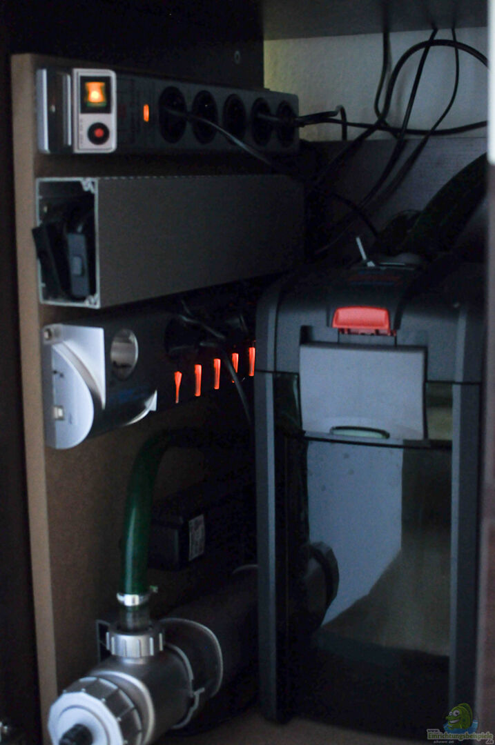 Reglerheizer Jäger 3619, 300W Strömungspumpe Tunze Turbelle nanostream 6025, 2.500l/h UV-KlärerJBL AquaCristal UV-C 36 W, 2h jeden 2. Tag Steckdosenleiste Gembird SIS-PMS, USB programmierbarer Timer Zwischenstecker mit FI-Schutz-Schalter