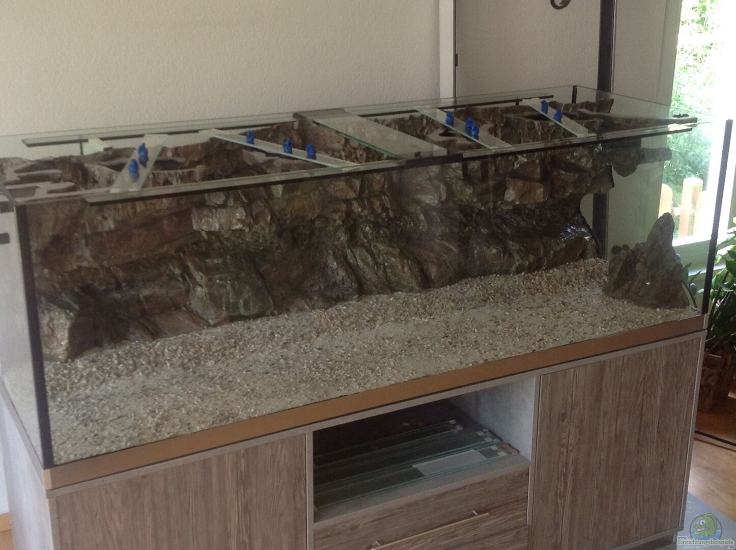 3D-Rückwand mit dahinter eingebautem biologischem 3-Kammer-Innenfilter, siehe: www.aquarienkontor...der-ewig-wartungsarme/ www.aquarienkontor...wandfilter-im-einsatz/ Unterschrank von K-Line-design (www.k-linedesign.ch/)