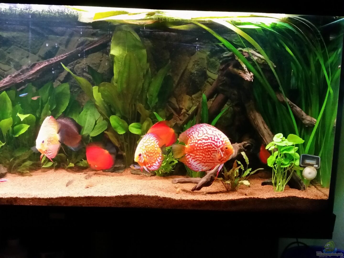 Hallo! Wollte mit diesem Aquarium den natürlichen Lebensraum der Disken nachstellen!Darum wurde das Hauptaugenmerk auf diverse Verstecke und Unterstände für die Fische gelegt! Wie schön zu sehen ist, wurde der Hintergrund dicht bepflanzt und die Wurzeln mit Ihren Unterständen sorgen für genügend Verstecke! Die Fische verstecken sich natürlich häufig, kommen aber auch ständig raus und drehen Ihre Runden im Becken, was natürlich ein toller Anblick ist! Fühlen sich sichtlich wohl! Ich [...]