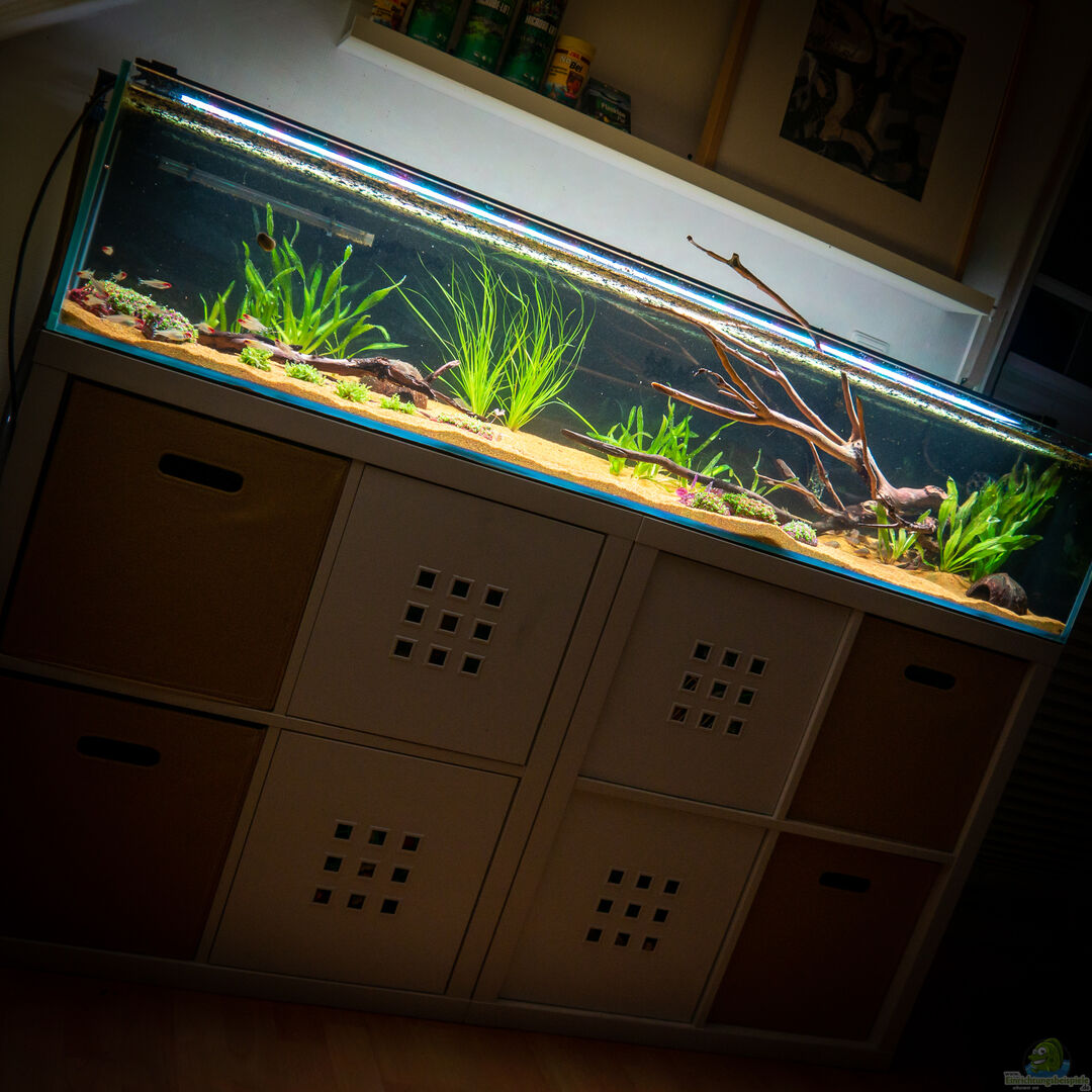 Das Aquarium ist speziell auf die Ma??e von zwei IKEA Kallax Würfelregale angepasst und aus 8mm Glas ohne Streben und transparent verklebt. Das Aquarium wirkt durch seine geringe Höhe im Vergleich zur Länge wirklich schick und ist mal ein etwas anderes Format.