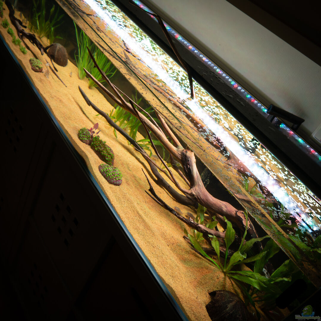 Das Aquarium ist speziell auf die Ma??e von zwei IKEA Kallax Würfelregale angepasst und aus 8mm Glas ohne Streben und transparent verklebt. Das Aquarium wirkt durch seine geringe Höhe im Vergleich zur Länge wirklich schick und ist mal ein etwas anderes Format.