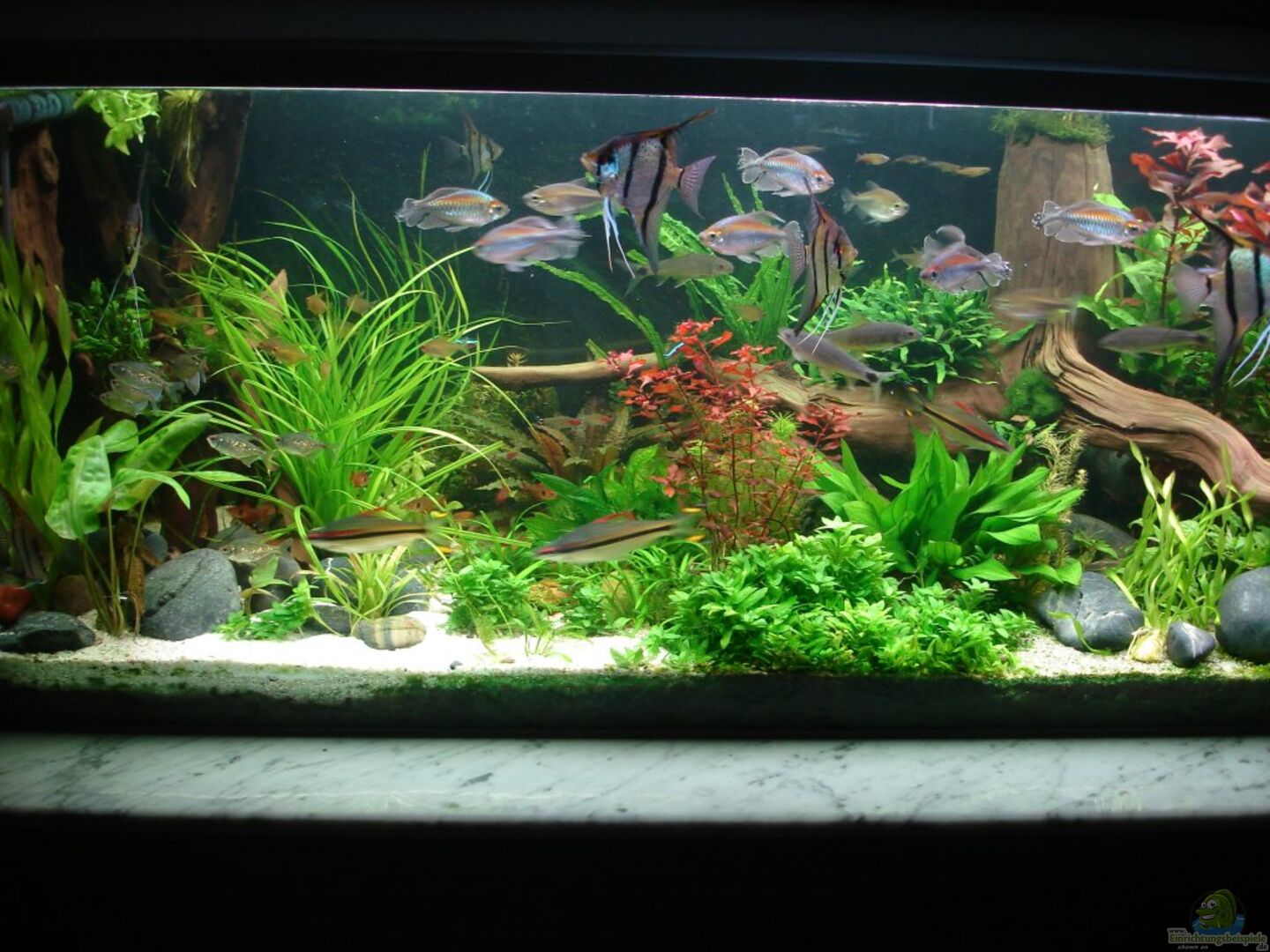 Juwel-Becken, 8 mm Float-Glas, Bodenscheibe 10 cmm Verkleidet von uns mit L-Aluschienen zur besseren Optik auf selbst gezimmertem Tisch, Filter stehen rechts und links
