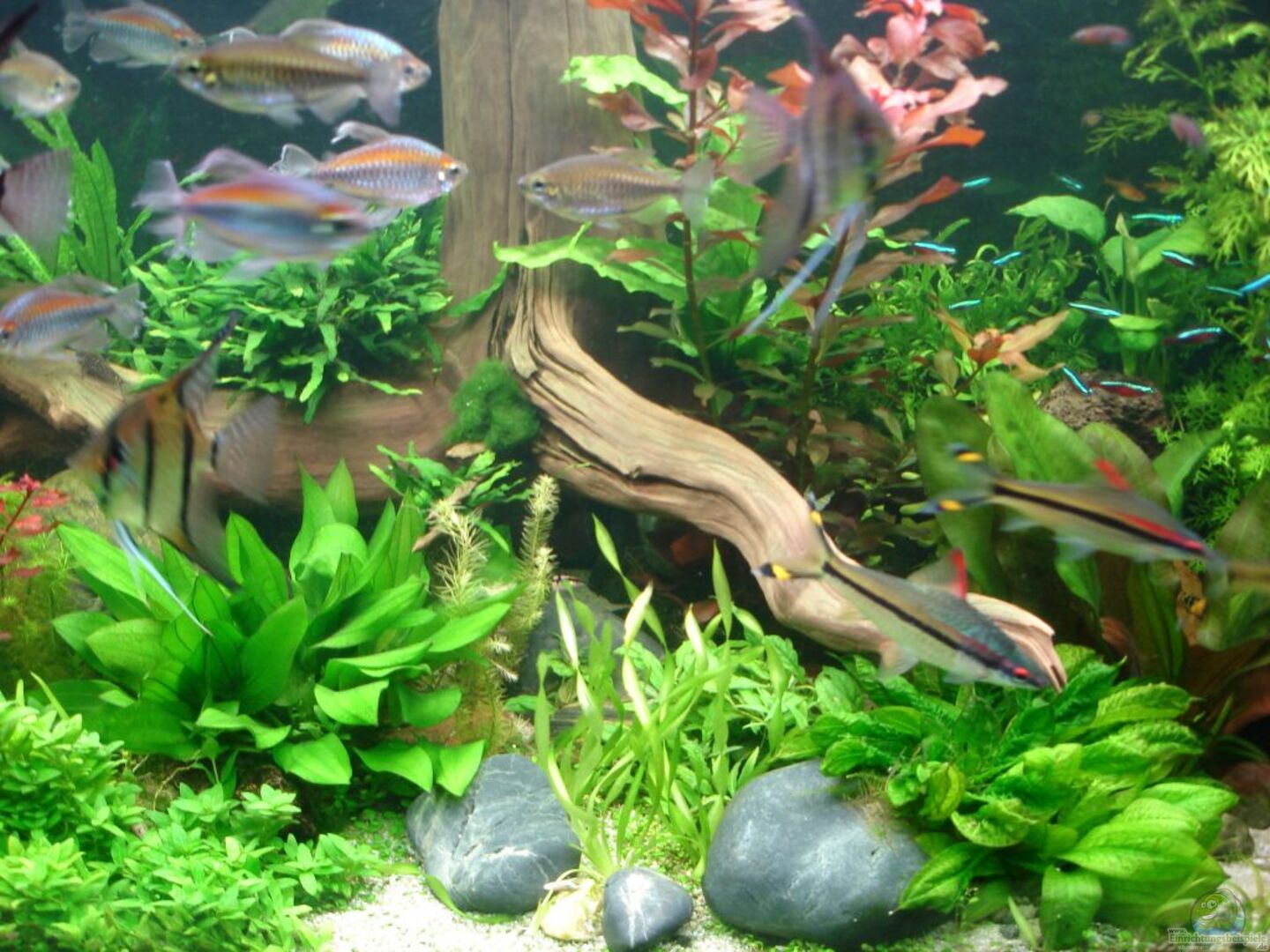 Juwel-Becken, 8 mm Float-Glas, Bodenscheibe 10 cmm Verkleidet von uns mit L-Aluschienen zur besseren Optik auf selbst gezimmertem Tisch, Filter stehen rechts und links