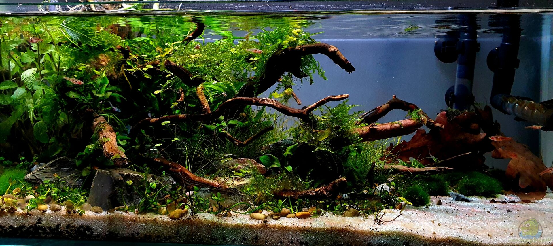 Besonders flaches Rechteck-Aquarium mit 17 Liter Inhalt und abgerundeten Ecken an der Frontscheibe. Hergestellt aus besonders hochwertigem Floatglas(Hersteller Blau Aquaristic) Erstes Aquascape/Naturaquarium, das einen seichten Nebenfluss darstellen soll bei dem Wurzeln hineinragen und eine dichte Randbepflanzung aufweisst und durch die Bepflanzung und Schwimmpflanzen teilweise beschattet wird.