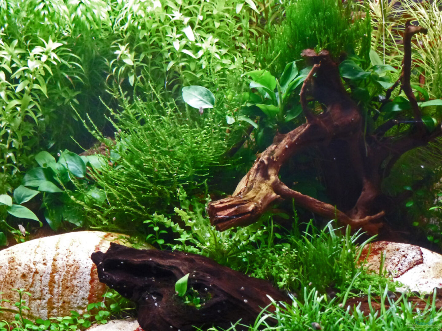 Desweiteren habe ich eine Rote Morkien Wurzel dezentral ins Becken gesetzt auf der die Anubias Nana Bonsai sowie die Bolbitis heteroclita difforms platz finden sollten. Zwei weitere Wurzeln wurde schräg vor und links neben der Hauptwurzel plaziert. Sieben Regenbogensteine verschiedener Grö??e gaben dem Becken seinen Namen und bilden einen schönen Kontrasst zum Grün der Pflanzen und dem dunklen Braun der Wurzeln.