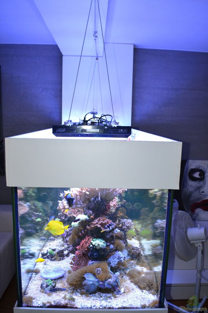 4 Bohrungen mit Ablaufschacht in der Mitte 40er Ablauf und 25er Zulauf Der Ablaufschacht hätte grö??er dimensioniert werden sollen, da 4000 l/h nicht so einfach 25cm passieren können. Das Becken selbst habe ich für 400 EUR anfertigen lassen. 60% Lebendgestein (LS) + 40% Keramikplatten ca. 45kg
