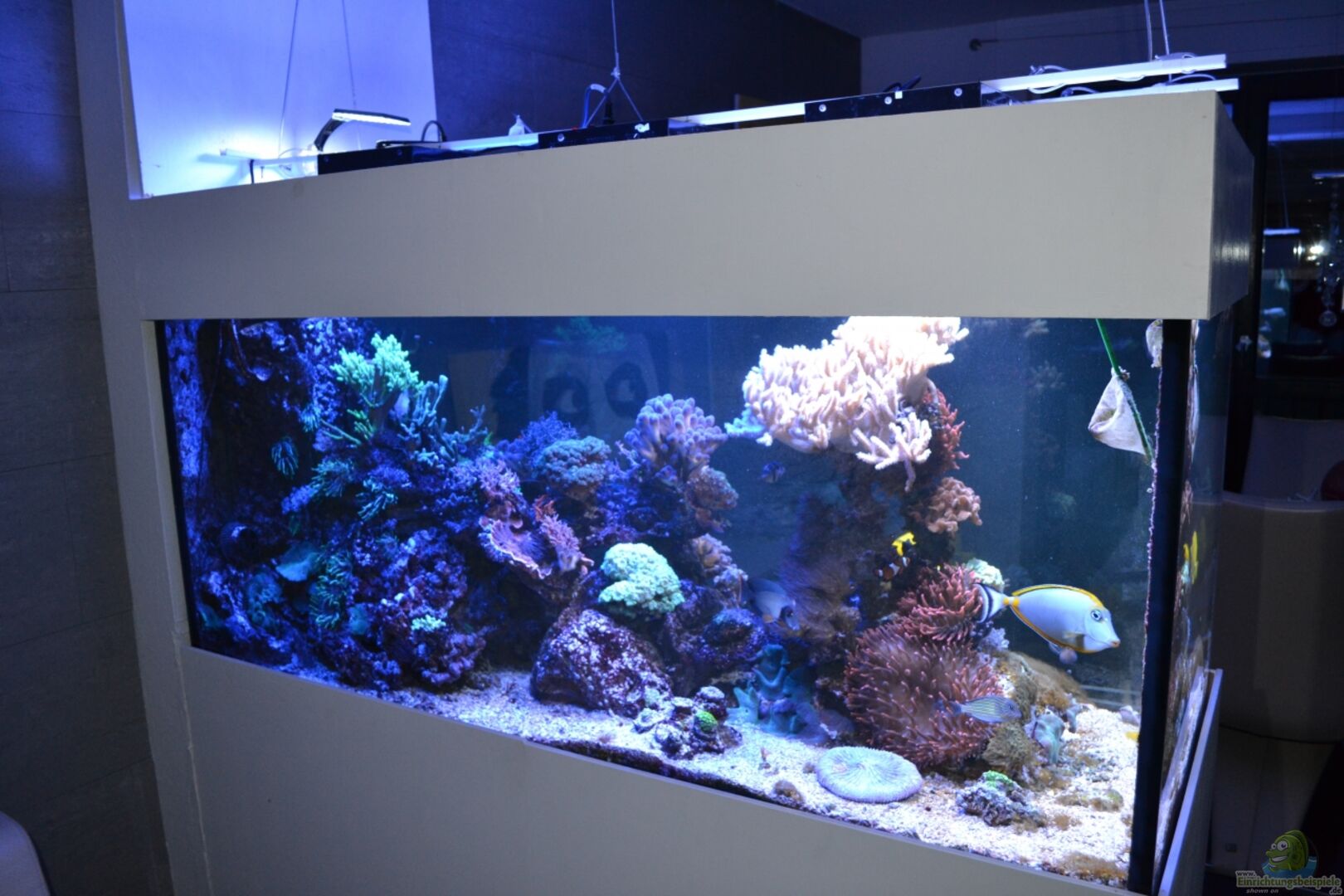 4 Bohrungen mit Ablaufschacht in der Mitte 40er Ablauf und 25er Zulauf Der Ablaufschacht hätte grö??er dimensioniert werden sollen, da 4000 l/h nicht so einfach 25cm passieren können. Das Becken selbst habe ich für 400 EUR anfertigen lassen. 60% Lebendgestein (LS) + 40% Keramikplatten ca. 45kg