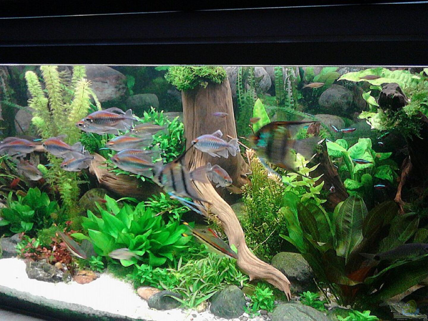 Juwel-Becken, 8 mm Float-Glas, Bodenscheibe 10 cmm Verkleidet von uns mit L-Aluschienen zur besseren Optik auf selbst gezimmertem Tisch, Filter stehen rechts und links