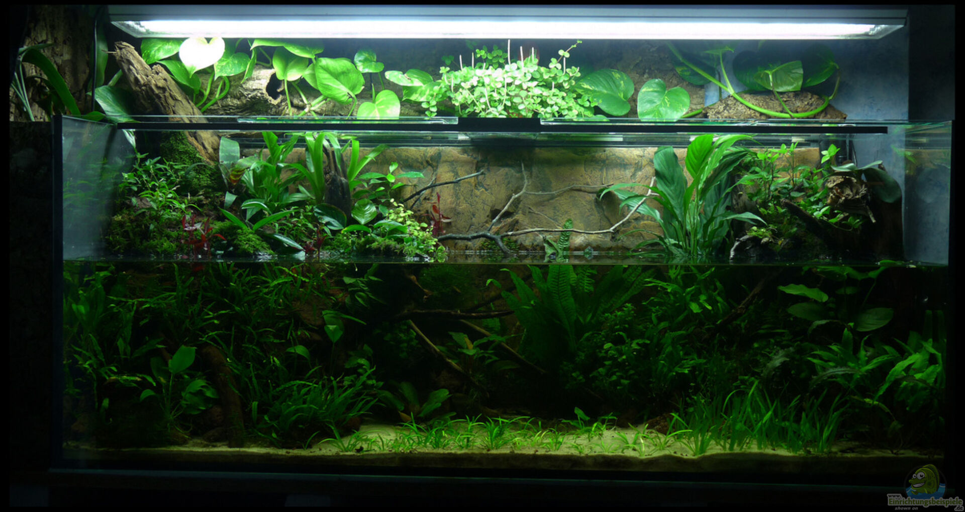 Nach Jahren im Bereich Südamerika und nur sehr mä??iger Bepflanzung wollte ich mal etwas ganz Neues machen. Habe daher die Einrichtungsbeispiele durchstöbert und bin beim Riparium von "serok" hängen geblieben. Gesagt, getan und so ist dann meine eigene Version eines Ripariums / Aquaterrariums entstanden. Wasserstand etwa 30cm, wieviel Wasser jetzt letztendlich im Becken ist, mag ich aber nicht einzuschätzen. Vermutlich irgendwas zwischen 150L und 200L. Aber das ist wirklich nur geschätzt. [...]