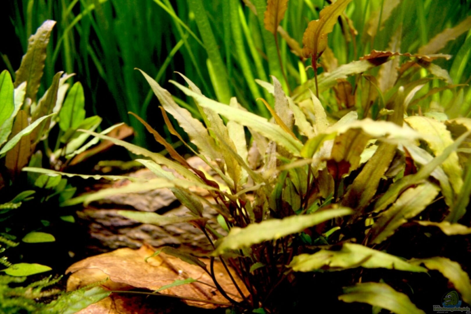 Vallisneria Spiralis (im Hindergrund), Cryptocoryne (3 verschiedene Arten), am Holz befestigtes Javamoos (mittlerweile zu prächtigen Beständen herangewachsen), Egeria densa im Hintergrund und Hornkraut. Oberfläche - Nixkraut
