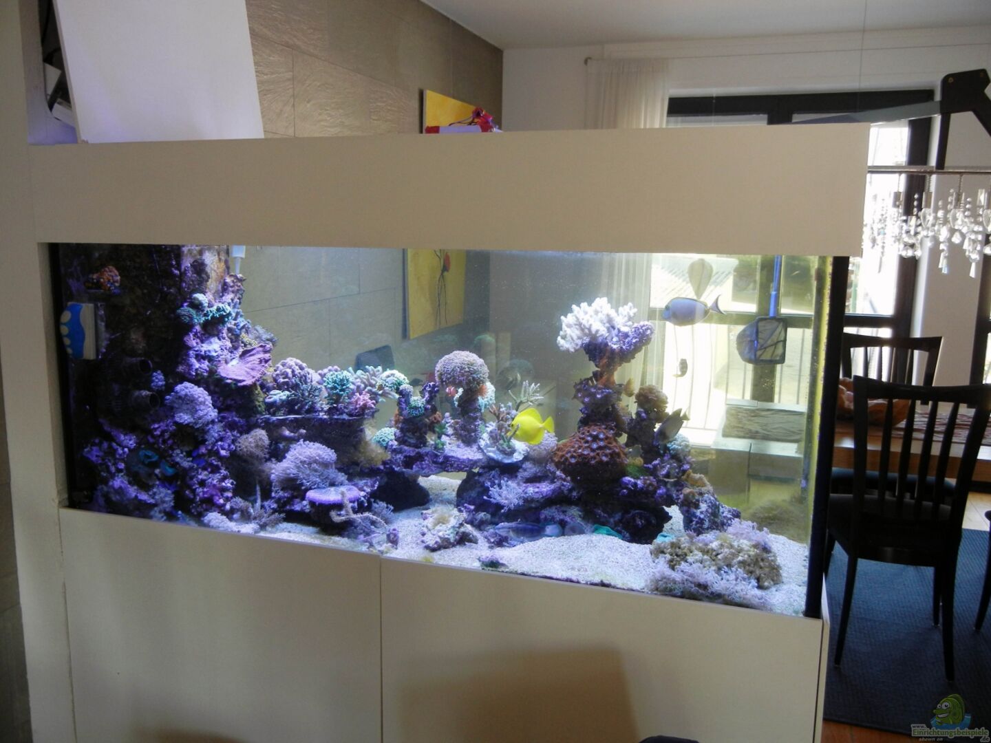 4 Bohrungen mit Ablaufschacht in der Mitte 40er Ablauf und 25er Zulauf Der Ablaufschacht hätte grö??er dimensioniert werden sollen, da 4000 l/h nicht so einfach 25cm passieren können. Das Becken selbst habe ich für 400 EUR anfertigen lassen. 60% Lebendgestein (LS) + 40% Keramikplatten ca. 45kg