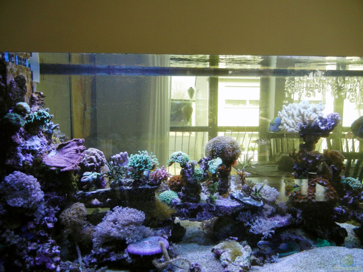 4 Bohrungen mit Ablaufschacht in der Mitte 40er Ablauf und 25er Zulauf Der Ablaufschacht hätte grö??er dimensioniert werden sollen, da 4000 l/h nicht so einfach 25cm passieren können. Das Becken selbst habe ich für 400 EUR anfertigen lassen. 60% Lebendgestein (LS) + 40% Keramikplatten ca. 45kg