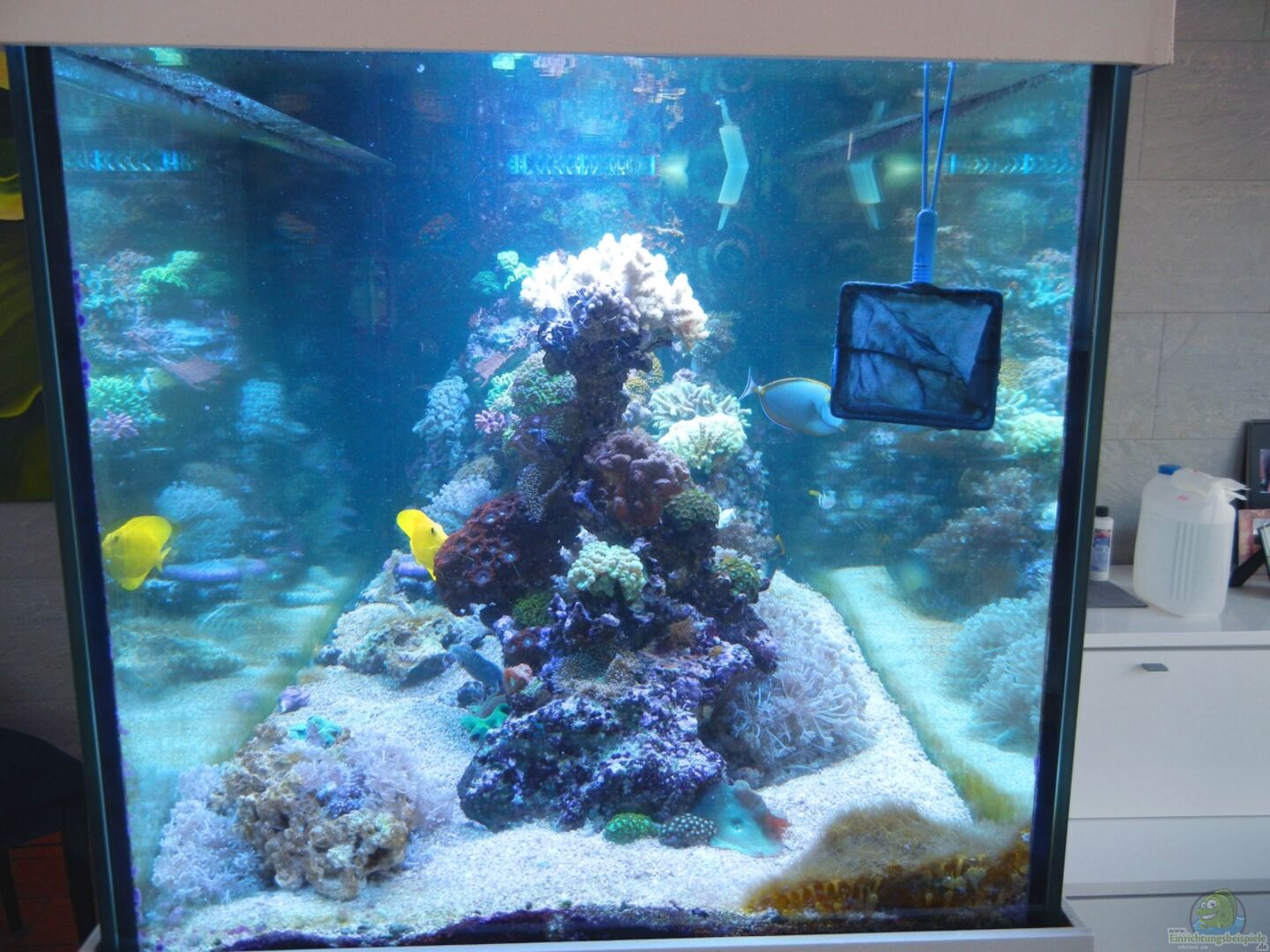 4 Bohrungen mit Ablaufschacht in der Mitte 40er Ablauf und 25er Zulauf Der Ablaufschacht hätte grö??er dimensioniert werden sollen, da 4000 l/h nicht so einfach 25cm passieren können. Das Becken selbst habe ich für 400 EUR anfertigen lassen. 60% Lebendgestein (LS) + 40% Keramikplatten ca. 45kg