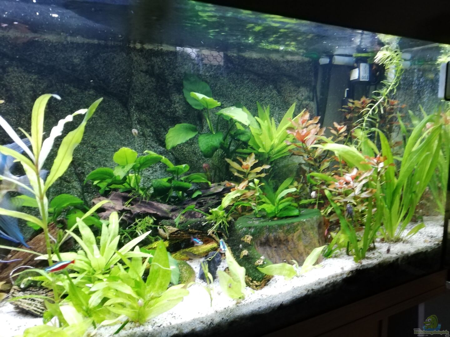 Deko und Höhlen und Verstecke aus cocosnuss und hohle baumstamm und steine aber die Baumstämme sind aus kunststoff und auch richtiges natur holz so Aquarienwurzeln usw.Und aus so mittelgrossen Kieselsteinen habe ich so eine art steingarten aufgebaut das hohlräume und nischen entstanden sind.