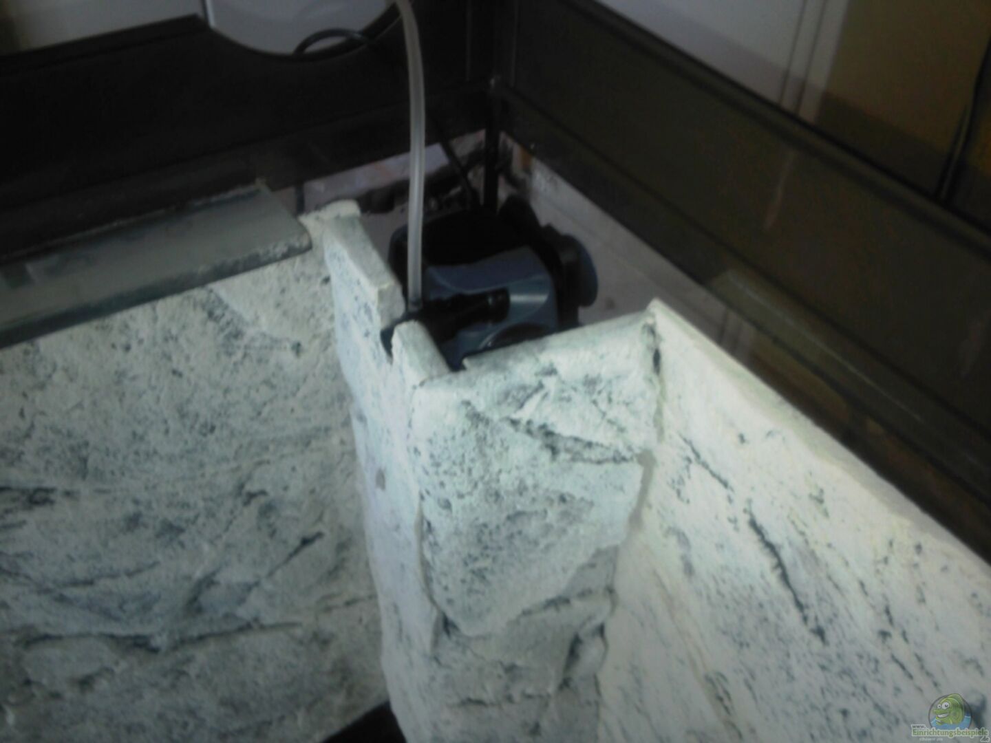 Das Aquarium ist rundum mit Slim-Line Back To Nature Rückwand bestückt, ist lediglich ca. 10 mm dick und nimmt nicht viel platz, die Technik ist hinter der Rückwand verstekt in 2 extra gebastelte schächte, alles mit Orca Unterwasserkleber geklebt. Circa 20 Kg Lochgestein (von alte Aquarium) und 50 Kg Naturstein .