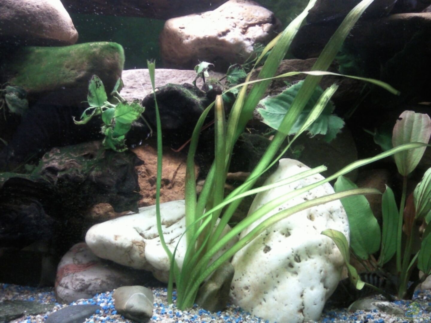 Verschiedene Ableger von Anubias var. nana Bonsai in die Steinaufbauten gesetzt und 3 auf Wurzeln gebunden, insgesamt 6 Stück Vallisneria Americana Gigantea jeweils zu zweit neu eingepflanzt, 1 schöne Echinodorus Tropica neu eingepflanzt. Noch einen Anubias Steckling eingesetzt.