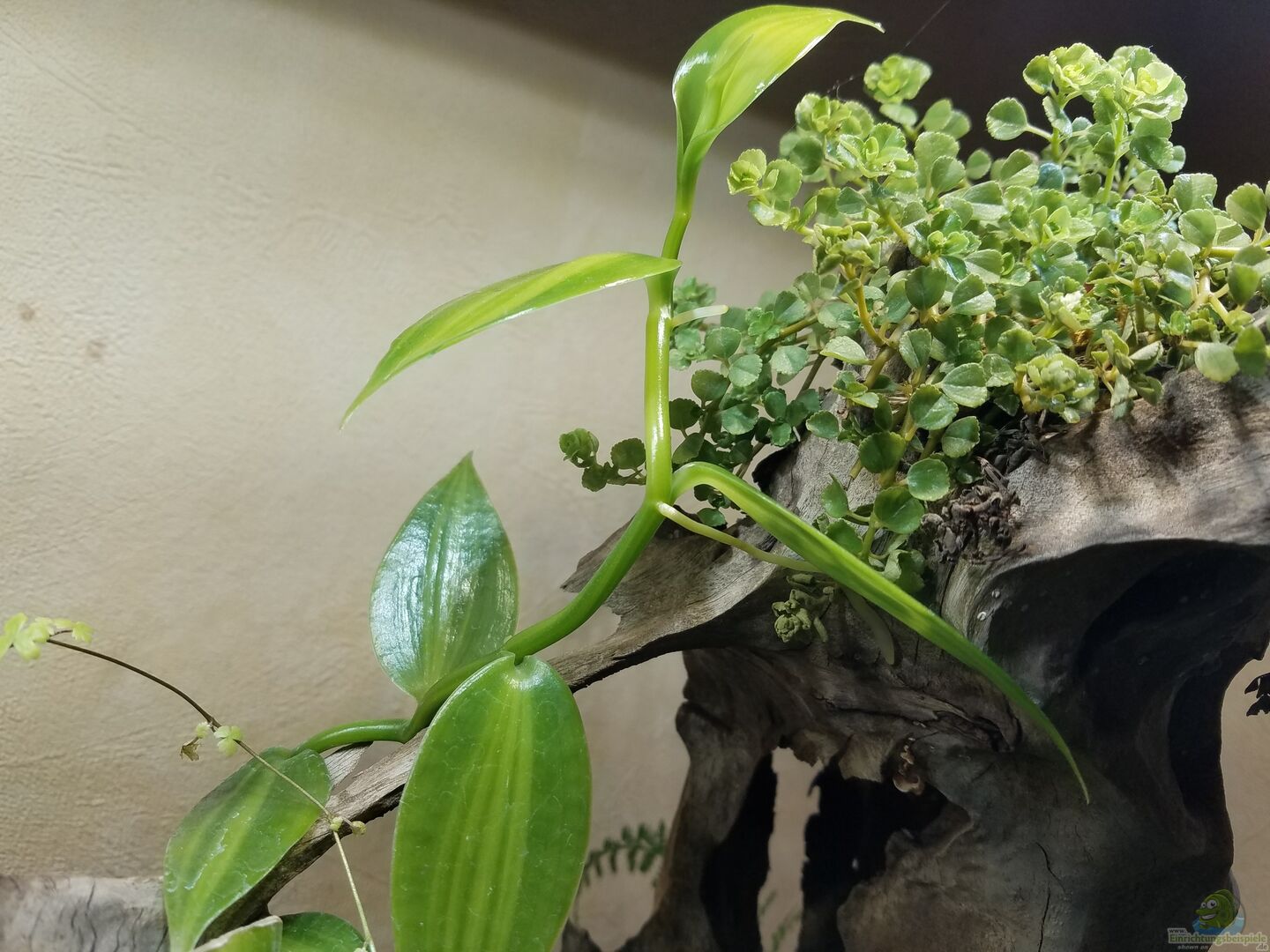 Das Becken wurde im Oktober 2018 neu eingerichtet. Es ist ein offenes Becken. An der rechten Seite steht eine Gro??e Wurzel, die aus dem Wasser steht, mit Bewuchs. Nicht alle Pflanzen sind aus dem Asiatischen Raum, hier wurde mehr auf eine schöne zusammenstellung geachtet, vermutlich werde ich hier noch in Zukunft weiter anpassen. Neu ist hier auch eine Vanille Orchidee die im moment sehr schön am Wachsen ist.