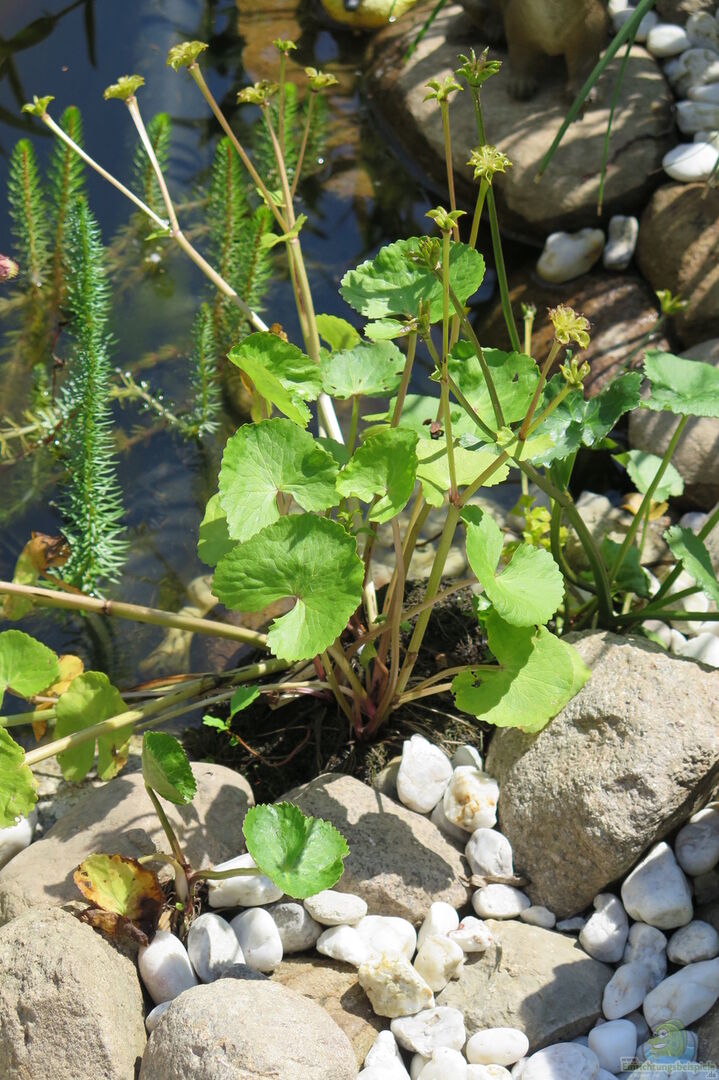 Im und um den Teich sind verschiedene Wasserpflanzen zu finden. Um eine zu starke Ausbreitung zu verhindern, sind alle - abgesehen von den Sumpfdotterblumen - in Körbe gepflanzt. Unter Wasser und teils über der Wasseroberfläche wachsen Tausendblatt, Wasserpest und Tannenwedel. Diese Pflanzen entziehen dem Wasser genügend Nähstoffe. Ich habe deshalb alle Pflanzen in Teicherde pflanzen können und mit übermä??igem Algenwuchs keine Probleme. Anfangs tauchten bei wärmeren Wetter zwar noch Fadenalgen [...]