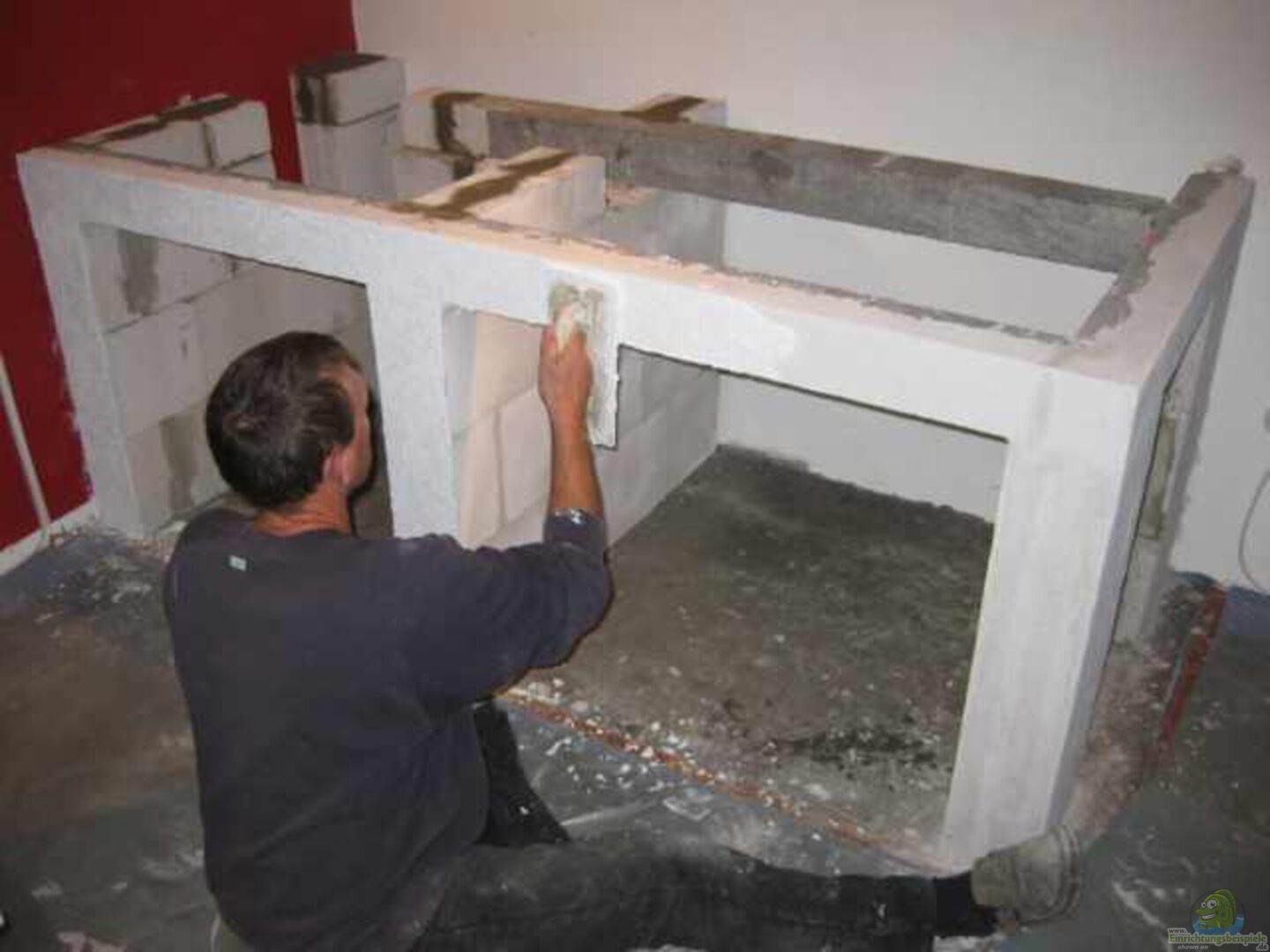 =================================================== Unterbau: Der Untergrund musste neu betoniert werden. Darauf mauerten wir das Untergestell mit 15 cm starken Kalksandsteinen. Als Träger nutzten wir Fensterstürze. Die komplette Unterkonstruktion wurde mit wei??em Rauputz verschönert. Um Unebenheiten auszugleichen wurde über die ganze Fläche Laminatdämmung geklebt. Die Unterplatte ist eine 2 cm starke Birken-Betonschalungsplatte, die nochmals mit Laminatdämmung, zum Ausgleichen von [...]