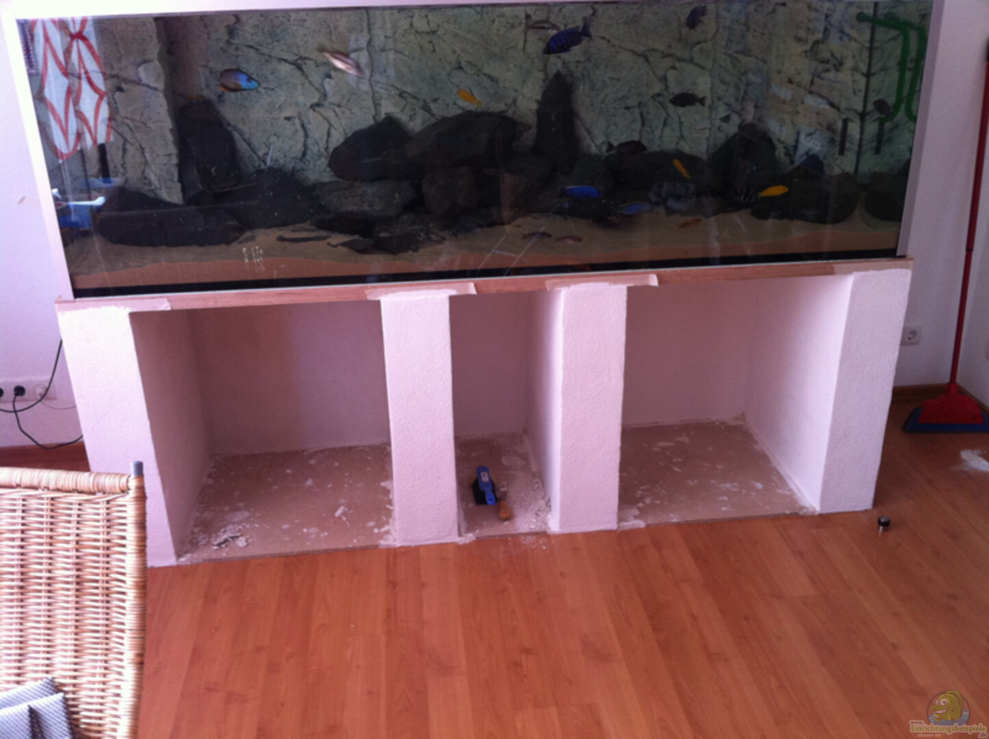 Sonderanfertigung 12 mm starken Floatglas sto??verklebt. Innen mit Sicherheitsnaht, zwei Querstege aus Glas. Unterbau mit 17, 5cm Ytong-Steinen und 5cm Steine an der Rückseite. Ausgelegt mit Laminat passend zum Boden. 5cm Multiplexplatte. 5mm Styrodur zum Ausgleich zwischen Platte und Glas.