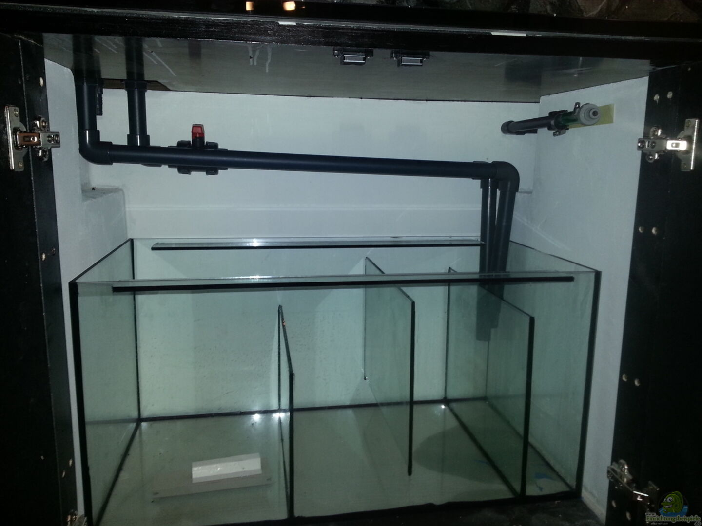 Für die erforderliche Oberflächenströmung sorgt, neben der Förderpumpe, eine Tunze 6055 mit bis zu 5.500 Ltr./Std. , welche ebenfalls über den ProfiLux gesteuert wird. Ein Regelheizer, der die Temperatur auf ca. 26 Grad regelt, ist in der Technikkammer des Filterbeckens integriert, ebenfalls der Temperatursensor sowie die PH-Elektrode. Beide werden ebenfalls über den ProfiLux gesteuert.
