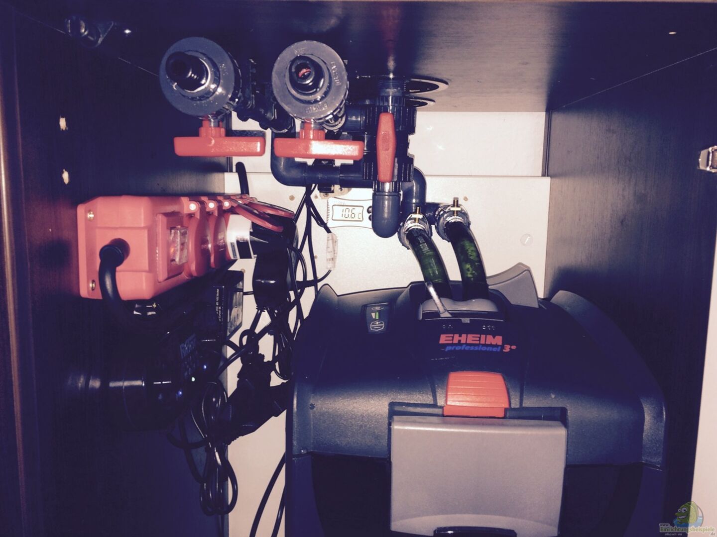 Hydor Koralia Smartwave mit 2 Hydor Koralia Nano 1600 l/h Aqua Medic Helix Max UV Klärer 11 Watt EHEIM J??GER thermocontrol Reglerheizer 200 Watt Anstatt dem typischen Filterschlauch habe ich mich für ein PVC Rohrsystem entschieden. Damit lässt sich der wöchentliche Wasserwechsel schnell erledigen.