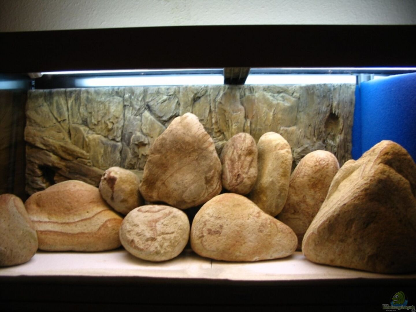 55 Kg Gestein; kalkhaltig, Sandgestein; Die Steine wurden so angeordnet, dass 6 getrennte Höhlen entstanden sind. 3 Höhlen haben mindestens 2 Eingänge. Zudem wurde noch eine ´Schwimm- und Fütterungszone´ eingerichtet. Die Steine wurden gründlich gewaschen und im Backofen mehrere Stunden ´durchgebacken´. Die Steine liegen auf 2 cm festem Styropurplatten. Und sie wurden untereinander mit Aquariumsilikon verklebt (Ist zwar sicher, aber Fische fangen wird dadurch zur reinen Nervenprobe). ACHTUNG! [...]