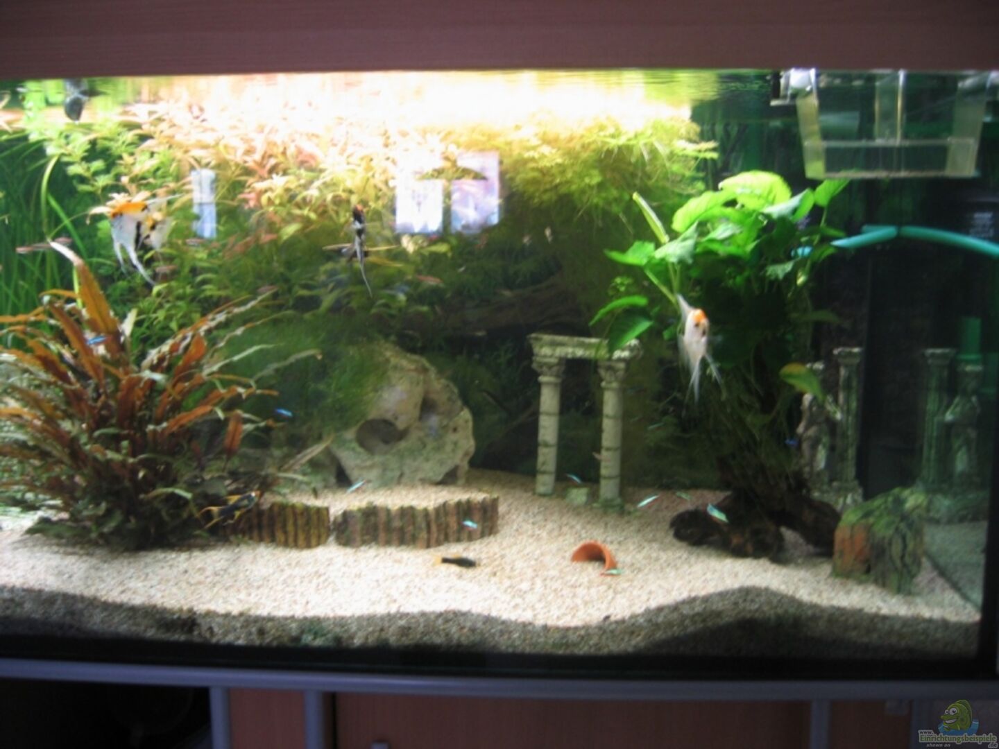 Im Becken befinden sich auch 3 kleine Tontöpfchen, Lochsteine, das Kolosseum, 2 Römischen Säulen ... einen kleinen ca 10 hohen Kunstfelsen (innen hohl)... der eine Wels hat sich in diesen Felsen verliebt! Ich darf den nicht mehr raus nehmen :-) Es hat auch noch 2 Terrassenstücke bei den Lochsteinen, 2 Stück 40cm ud 60 cm Moorkienholz für meine Welse.